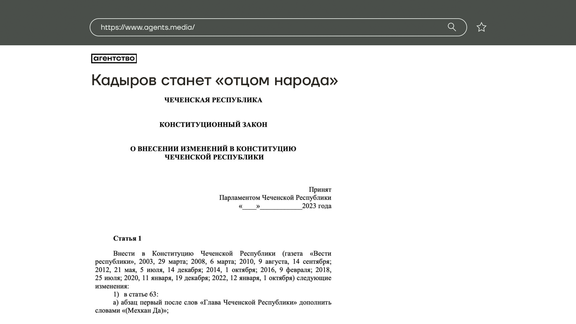 А Кадыров может стать «Отцом народа». Именно такой титул, по-чеченски «Мекхан Да», ему хотят прописать прямо в Конституции Чеченской Республики. Этот законопроект появился еще 12 января, но заметили его только вчера. Вероятно, все пытаются провернуть по-тихому.