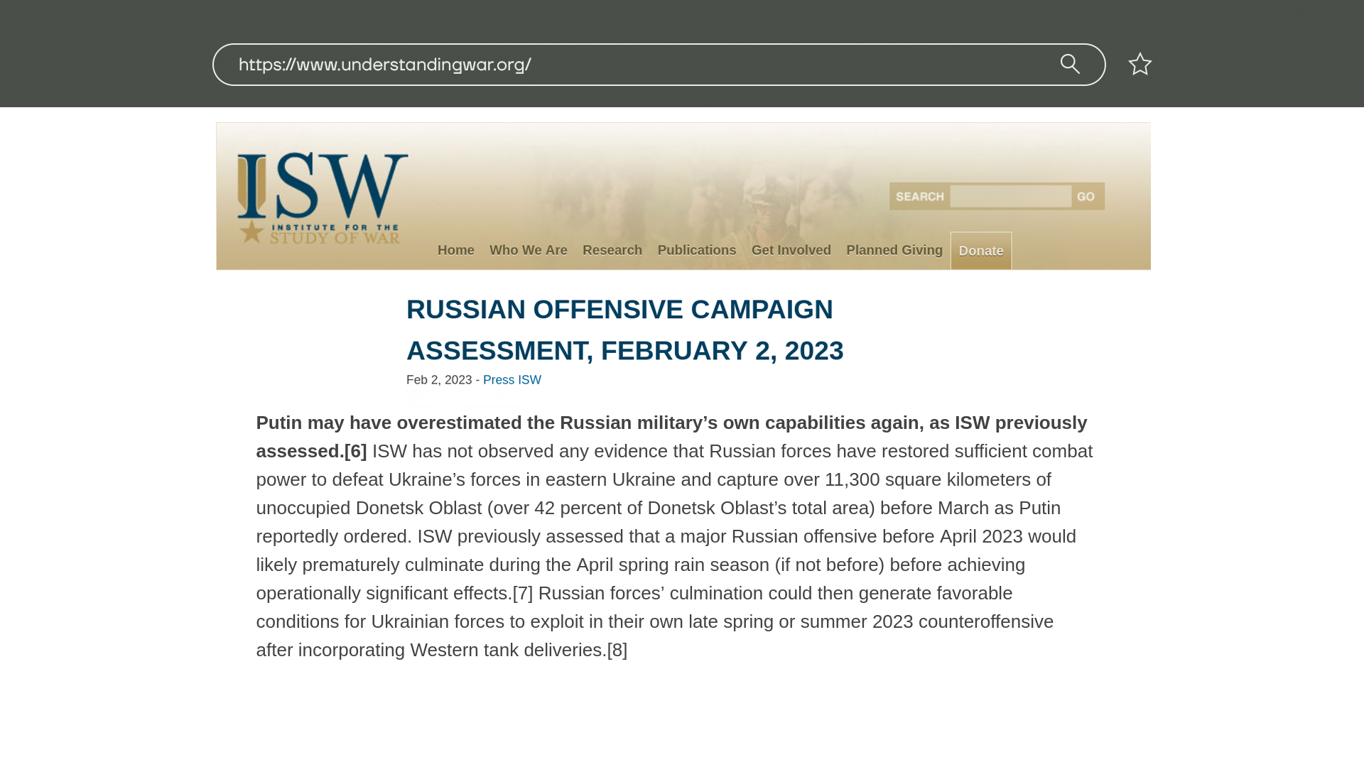 А вот американский Институт изучения войны считает, что российское руководство переоценивает готовность армии к наступлению. Нужную военную мощь путинские части не накопили, а ожидаемые крупные атаки завершатся к апрелю.