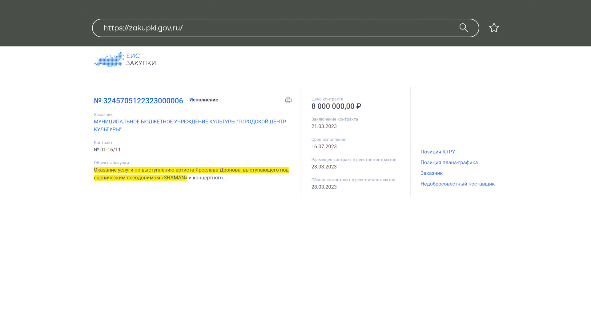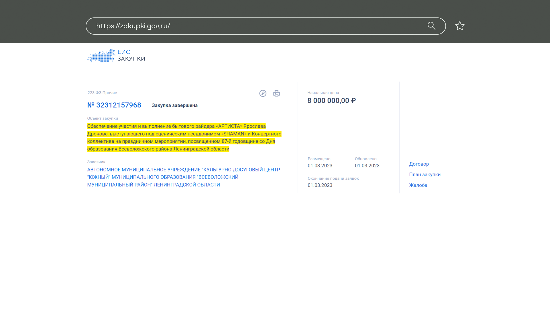 Зато у кого с деньгами проблем нет, так это у Норильска и у Всеволожского района Ленинградской области. Там, видимо, денег в бюджете с избытком и проблемы все решены, раз они могу себе позволить госзакупки на 8 миллионов рублей за выступления певца Шамана.