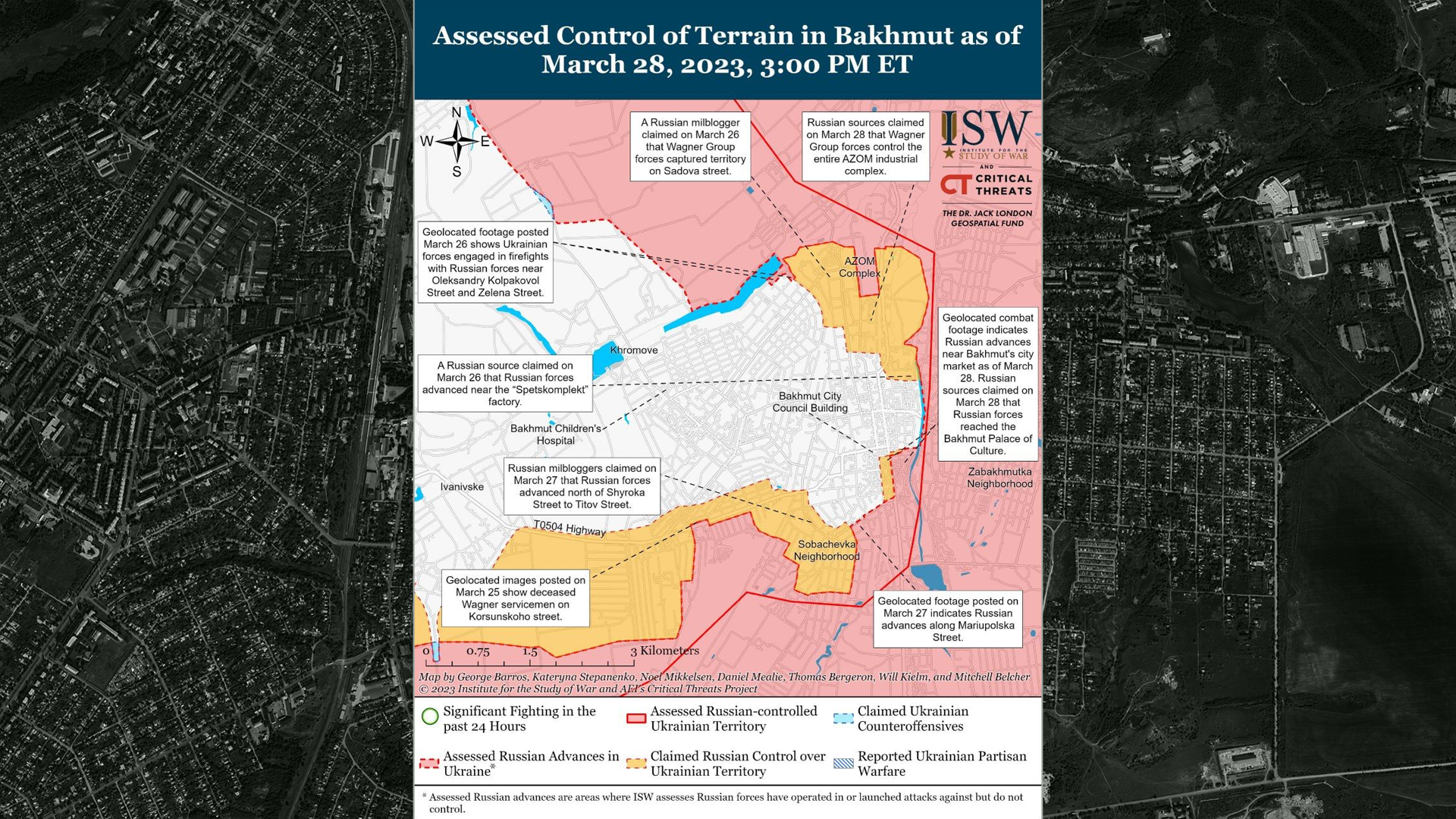 Битва за Бахмут продолжается, хотя количество российских атак уменьшилось в сравнении с прошлыми неделями. Британская разведка считает, что ключевым успехом украинских сил было то, что они не дали отрезать дорогу на Часов Яр. Это позволяет продолжать снабжать город. Проезд по ней очень опасен, вся обочина усыпана уничтоженными машинами.