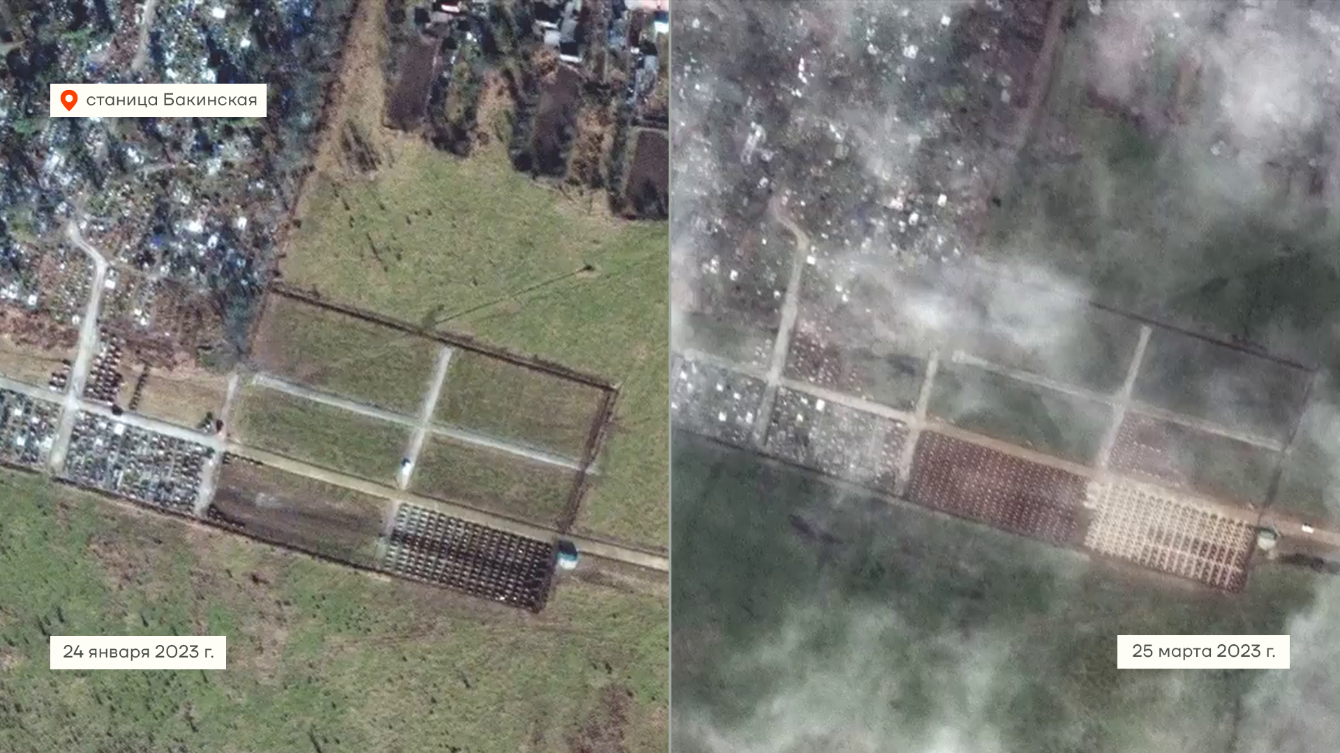 В станице Бакинская, это там, где самое большое захоронение вагнеровцев, за два месяца появились сотни новых могил. Вот такими снимками со спутника поделился журналист New York Times. На снимках хорошо видно, как расширилось кладбище всего за 2 месяца. Сейчас там похоронено около 600 человек.