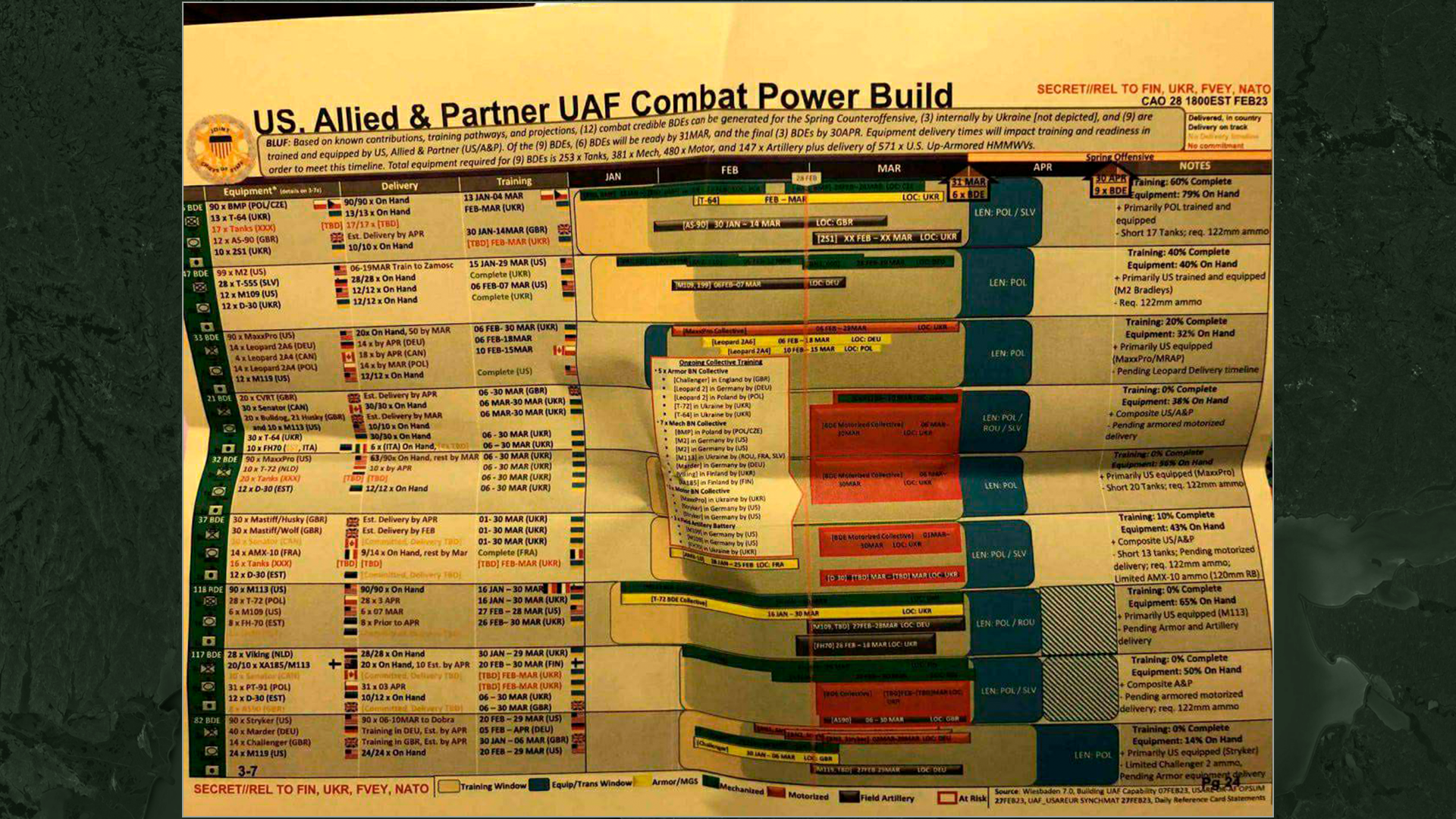 Российские телеграм-каналы публикуют якобы слитые документы Пентагона с информацией по украинскому контрнаступлению. The New York Times пишет, что Пентагон даже начал расследование утечки документов с грифом «Совершенно секретно». Сами документы содержат не так много полезной информации, в основном о поставках оружия. Так сказано, что всего Украина готовит 12 бригад, которые получат 253 танка, 381 единицу гусеничной техники и 480 единиц колесной. 147 гаубиц и 571 хаммер.