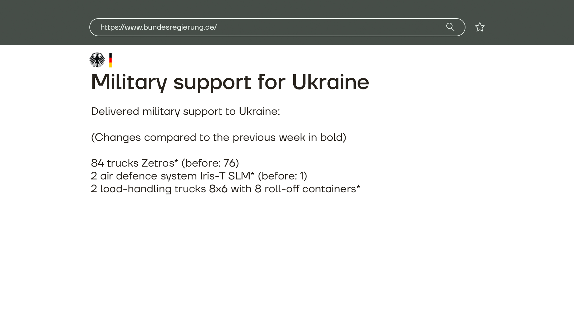 Германия подтвердила поставки новой военной помощи Украине. Сообщение об этом появилось на сайте правительства ФРГ. В пакет вошли дополнительные системы ПВО Iris-T SLM и 10 армейских грузовиков. IRIS-T — это одна из самых современных систем ПВО, она хорошо зарекомендовала себя, в частности, при защите гражданских объектов в Киеве.