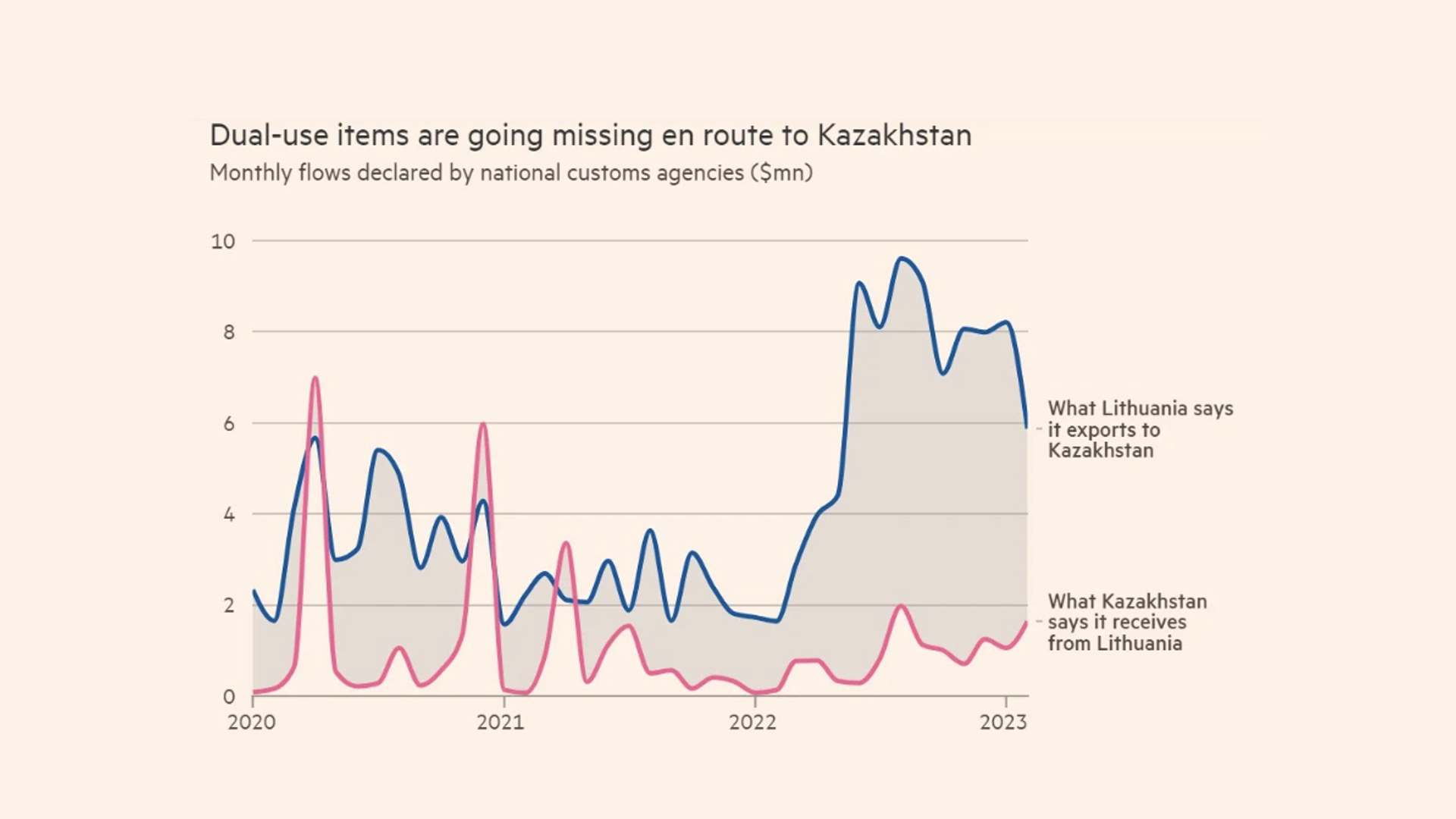 Вот, например, графика, сколько было отправлено из Литвы в Казахстан, и вот сколько Казахстан получил.