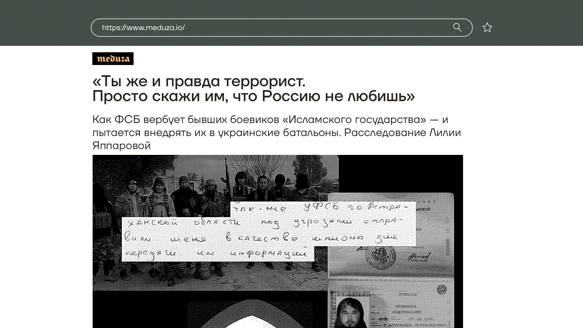 А еще «Медуза» выяснила, что ФСБ вербует бывших боевиков «ИГИЛа», чтобы внедрять их в Украинские батальоны. Уже известны 4 таких эпизода. Завербованным ставят задачу попасть в крымскотатарский батальон или чеченскую группировку, которые воюют на стороне ВСУ, и дают заказы на убийство людей. Еще пытаются внедрять своих агентов в США. С февраля 2022 года пограничники США вычислили около 50 таких завербованных россиян. Почти все они рассказывали одну и ту же историю: что они активисты или журналисты, которых преследуют в России.