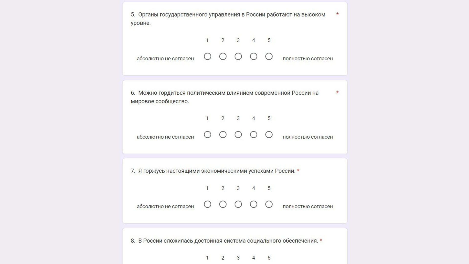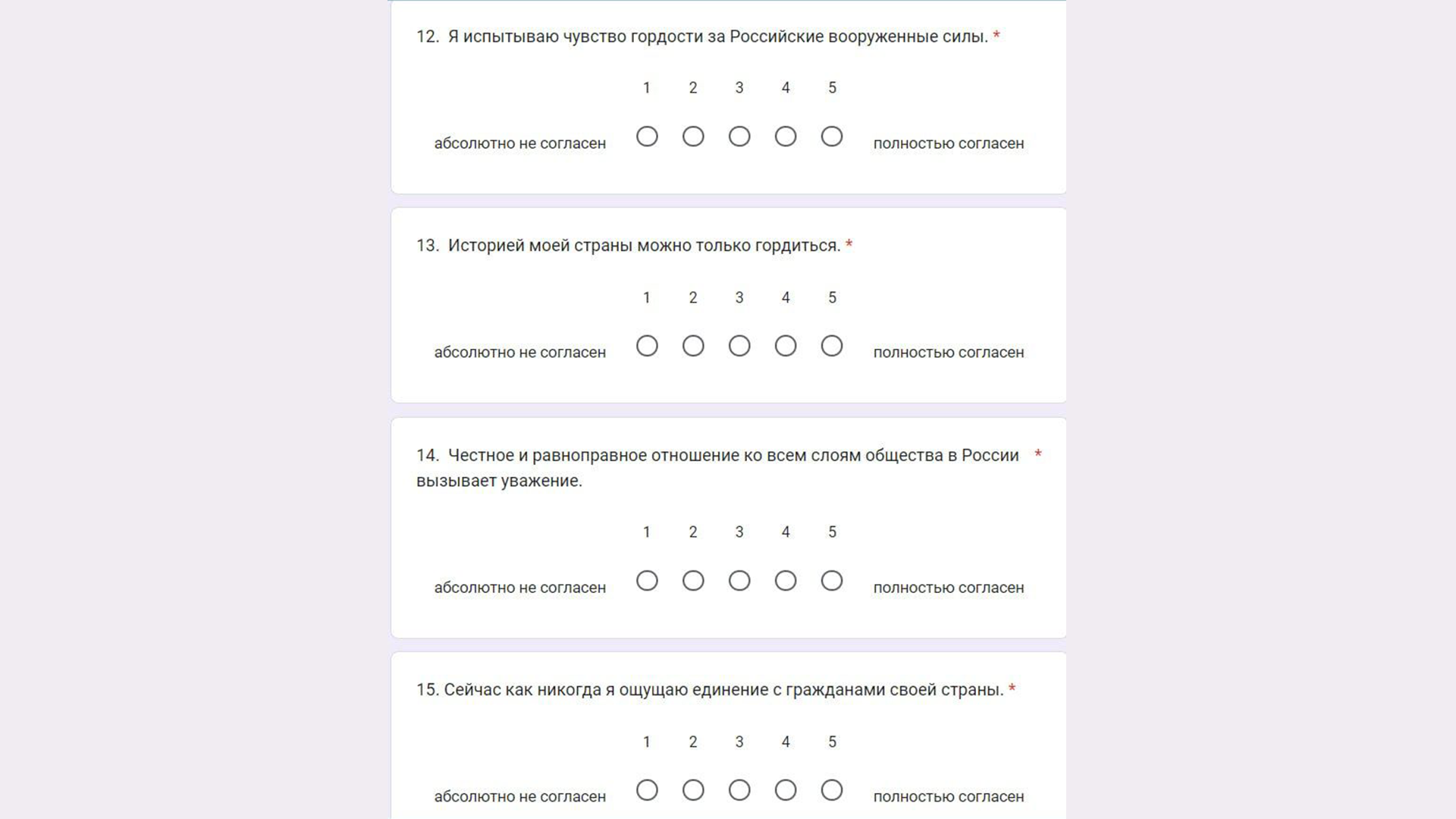 А в Чите студентов заставляют проходит опрос «Гражданская идентичность российской молодежи». Опрос должен определить уровень патриотизма и гордости за свою национальность. В опросе нужно отметить, насколько ты гордишься экономическими успехами, политическим влиянием России на мировое сообщество, насколько ты гордишься действиями вооруженных сил России и прочие абсурдные вопросы в формулировке «горжусь».