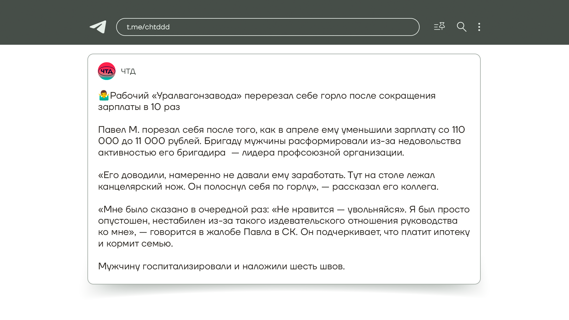 А вот у рабочего с «Уралвагонзавода» теперь и половины зарплаты нет, ему сократили ее аж в 10 раз. Всегда получал 110 тысяч рублей, а теперь только 11. Все из-за того, что расформировали бригаду. Мужчине сказали, что если его что-то не устраивает, то он может уволиться. Рабочего это так расстроило, что он взял канцелярский нож и полоснул себя по горлу. Его госпитализировали и наложили 6 швов.