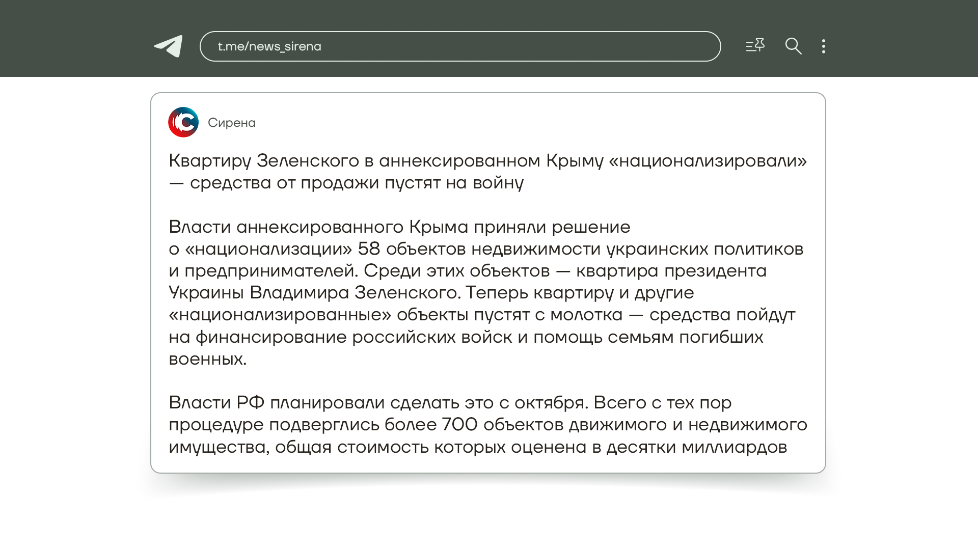 Власти аннексированного Крыма национализировали 58 объектов недвижимости украинских политиков и бизнесменов. Среди этих объектов оказалась и квартира Владимира Зеленского. Деньги, как говорят, идут на финансирование российских войск и помощь семьям погибших. С октября прошлого года национализировали уже более 700 объектов на десятки миллиардов рублей. Все для того, чтобы продолжать преступную войну в Украине и убивать мирных жителей.