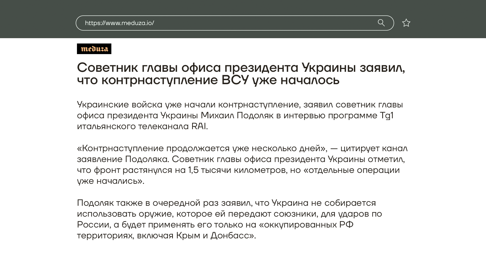 Тем временем Михаил Подоляк в интервью итальянскому телеканалу заявил, что украинское контрнаступление уже началось и продолжается несколько дней — идут отдельные операции. Он добавил, что переданное Западом оружие украинская армия будет использовать только на оккупированных территориях.