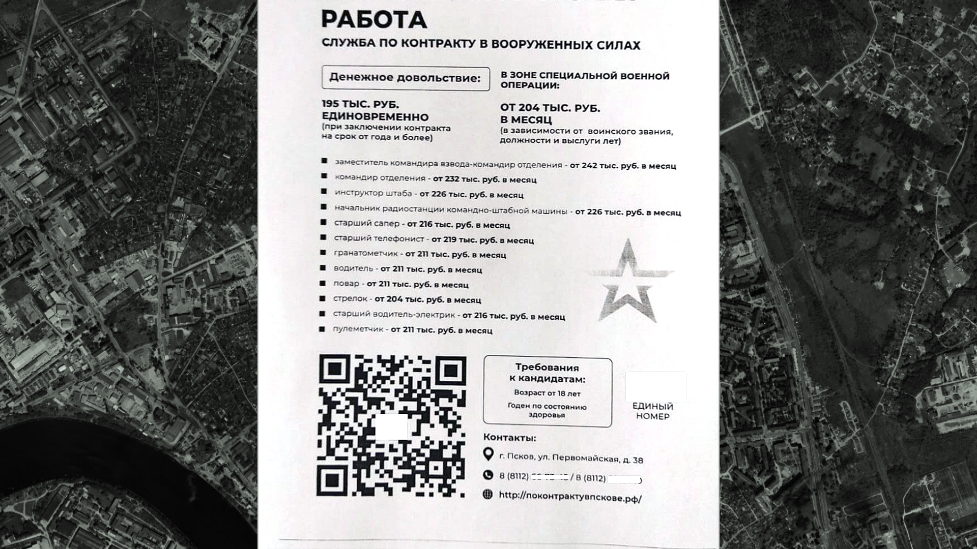 Чиновникам на погибших солдат, конечно, плевать, им нужны новые. Поэтому в Псковской области комитет по региональному контролю и надзору рассылает по ТСЖ «просьбы» размещать рекламу контрактной службы. Получаешь платежку и понимаешь, что это решение, потому что там написаны просто космические для многих регионов суммы зарплат. Только нужно добавлять, что вы придете на место досрочно выбывшего на кладбище солдата.