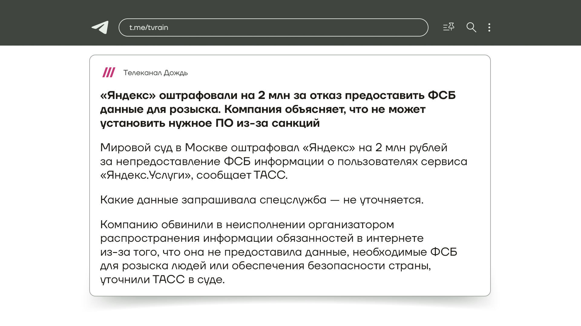 Мировой суд оштрафовал «Яндекс» на 2 миллиона рублей. Все потому, что компания отказалась предоставлять ФСБ данные о своих пользователях. Но дело не в том, что в руководителях «Яндекса» проснулась совесть. Оказалось, что причина в санкциях. Сервис «Яндекс.Услуги» не может передавать информацию ФСБ, потому что из-за санкций невозможно купить и установить нужное программное обеспечение.
