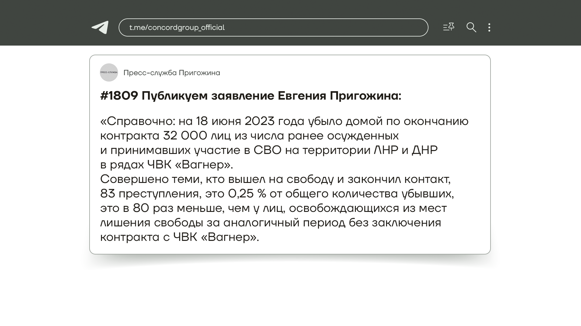 Пресс-служба Пригожина сообщила, что 32 тысячи бывших заключенных вернулись с фронта домой. При этом Пригожин отмечает, что вернувшиеся с войны зэки совершили 83 преступления — якобы намного меньше, чем те, кто после тюрьмы на войне не был. Проверить его слова сложно, но мы уже слышали истории о том, как вагнеровцы насиловали школьниц, грабили магазины, угрожали всех взорвать и так далее.
