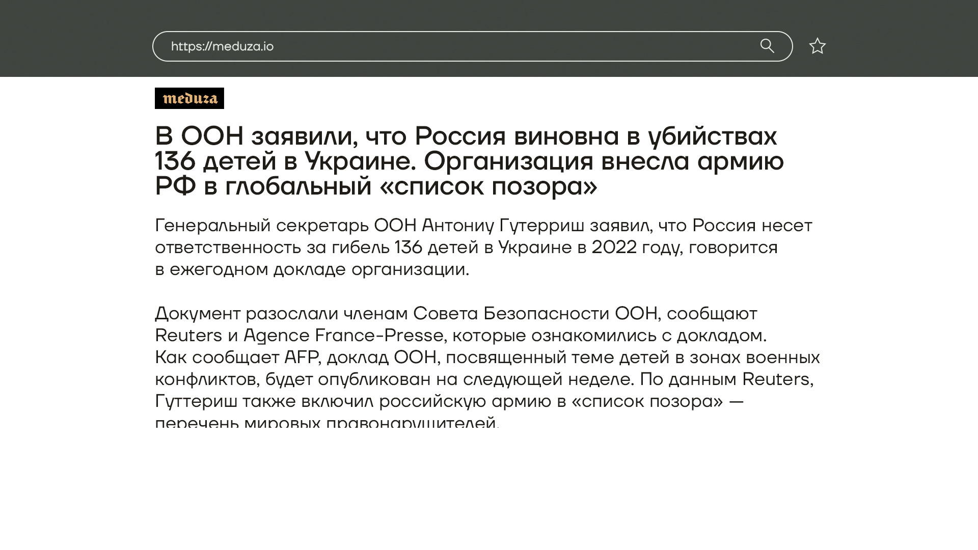 Тем временем ООН опубликовала свой ежегодный доклад . Из него следует, что в прошлом году в Украине были убиты 477 детей. Организации удалось доказать причастность российских войск к смерти 136 из них, еще 80 детей погибли в результате действий украинской армии.