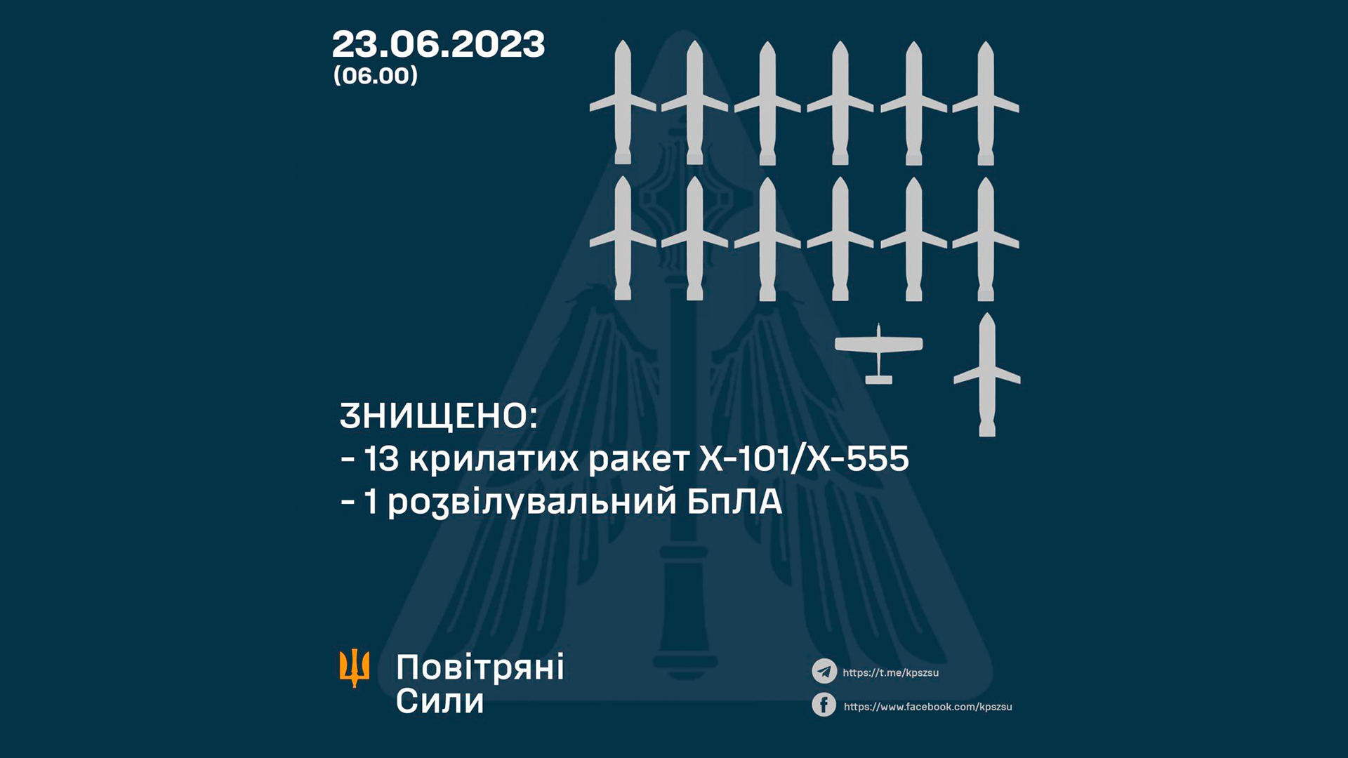 Ночью крылатые ракеты атаковали Хмельницкую область. Силами ПВО были уничтожены 13 ракет. Украинская сторона заявляет, что целью был военный аэродром. Ракетами С-300 обстреливали город Запорожье. Ракеты упали на открытой местности, обошлось без пострадавших.