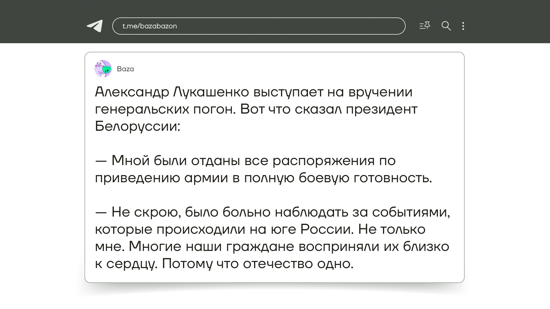 А вообще вчера в новостях об обращении Путина фигурировал еще и великий переговорщик, которому Путин очень благодарен за миротворческий труд во благо России - Александр Лукашенко. Белорусские СМИ сообщали, что Лукашенко тоже обратиться к народу. Некоторые даже считали, что обращение будет парным. Но Лукашенко появился только сегодня, на вручении генеральских погон. Говорит, что привел армию в боевую готовность и что больно было наблюдать за тем, что происходило в России, ведь у двух стран одно отечество. Про Пригожина и как же ему удалось провести с ним переговоры - пока ни слова, но журналисты кремлевского пула говорят, что подробности скоро будут опубликованы.
