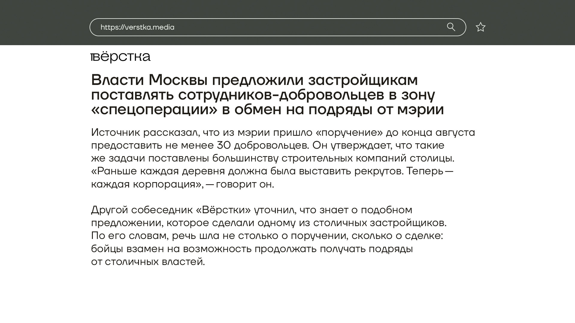 А в Москве ради пополнения рядов мобилизованных строительным компаниям за работников обещают подряды от мэрии. Такую сделку застройщикам предложили власти столицы. До конца августа — по 30 добровольцев с компании. Насколько ультимативная эта просьба, неизвестно. Набирать добровольцев на войну властям становиться все сложнее, что не может не радовать, конечно.