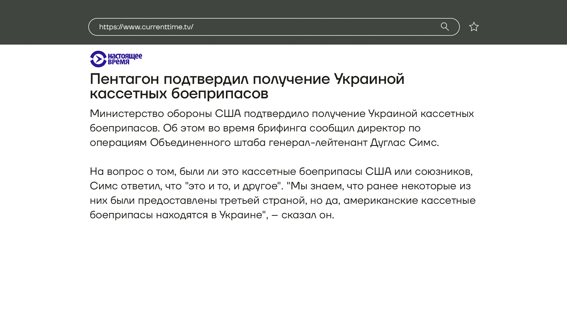 Министерство обороны США подтвердило, что Украина получила кассетные боеприпасы. На вопрос о том, были ли это кассетные боеприпасы США или союзников, представитель Пентагона ответил: «Это и то, и другое», — так сотрудник Пентагона подтвердил поставки кассетных боеприпасов не только из США. О передаче Штатами этого вида снарядов было объявлено неделю назад. Обе воюющие стороны применяют такие снаряды с первых дней вторжения.