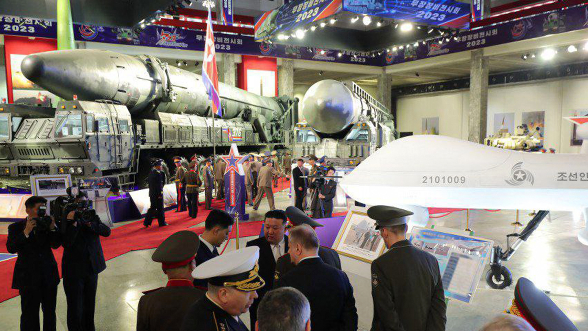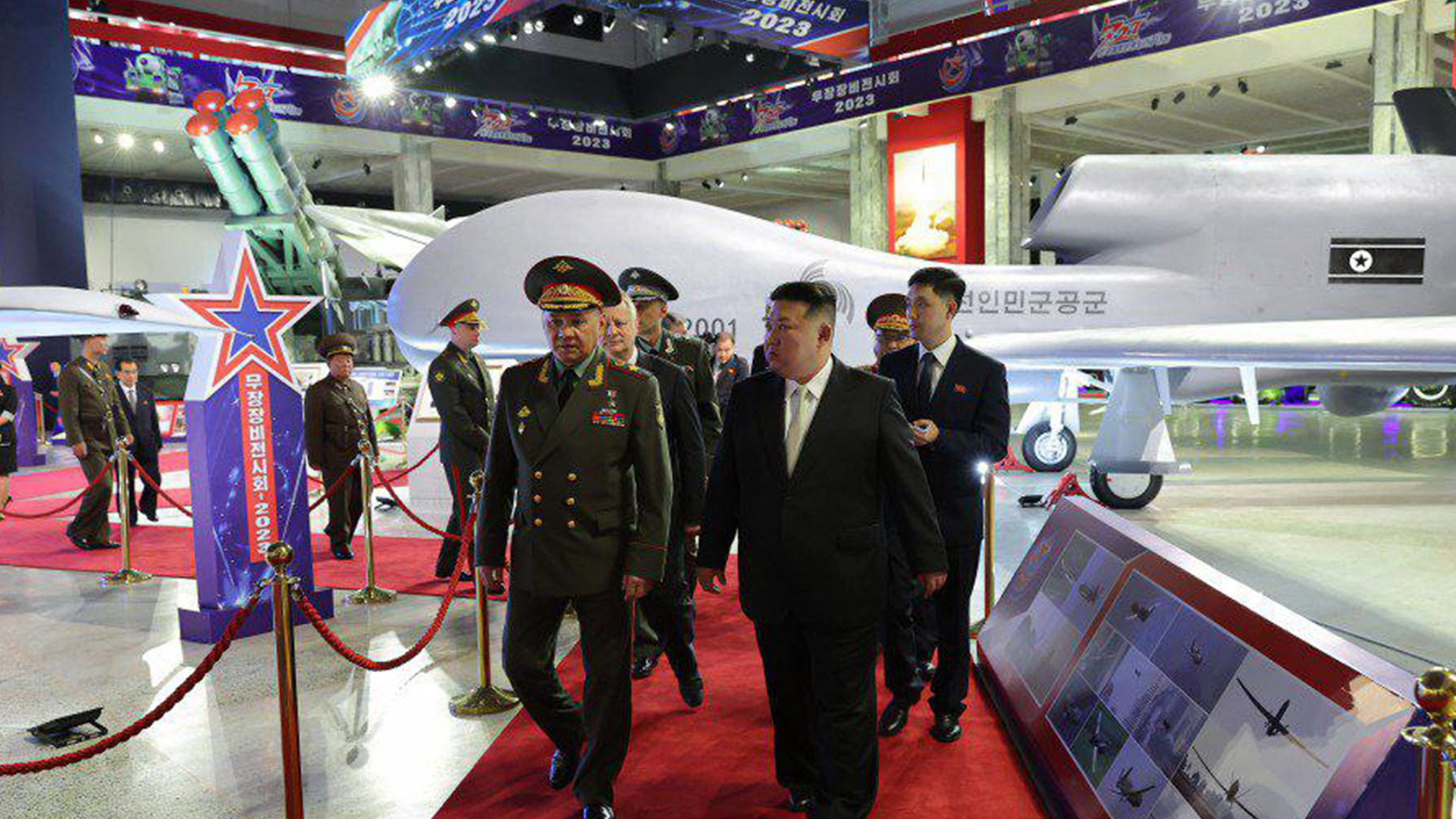 Продолжается визит Шойгу в КНДР. Судя по выражению лица Шойгу на фотографиях последних двух дней, атмосфера в стране министру обороны более чем нравится. Вместе с Ким Чен Ыном они посетили «выставку вооружений» оборонно-промышленного комплекса. Северокорейский лидер прогулялся с Шойгу по складам с ядерными боеприпасами, показал межконтинентальные баллистические ракеты и новые беспилотники, которые уж очень напоминают американские.