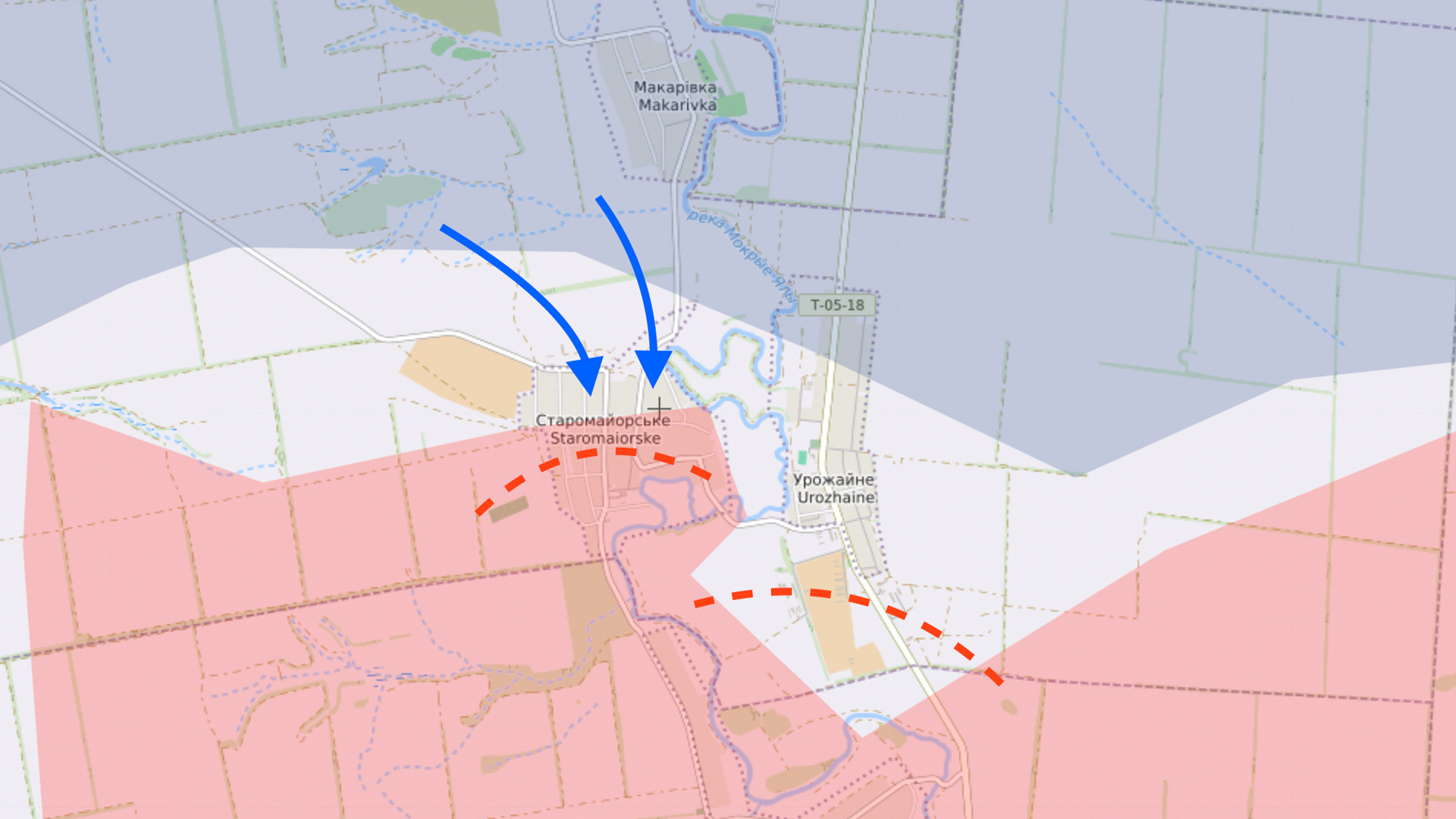 В боях за Старомайорское украинским военным удалось закрепиться на окраинах села. Например, украинские спецназовцы выложили видео, где российские солдаты сдаются в плен. Сначала они ведут бой, потом выходят из дома, их выводят в плен. Раз это происходит относительно спокойно, значит бои в этой части Старомайорского уже не такие напряженные и как минимум часть села контролируют ВСУ.