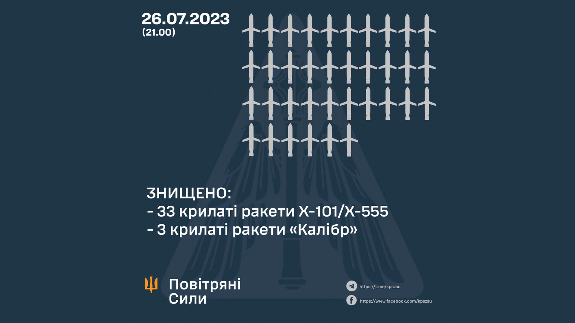 Вчера вечером российская авиация нанесла массированный удар по Украине крылатыми ракетами. Таких атак, чисто ракетных, не было уже давно. Применялись Х-101 и, вероятно, Х-555. Украинская ПВО сообщает, что сбиты все 36 из 36 запущенных ракет. Кроме того, писали о запуске четырех «Кинжалов» в районе Хмельницкой области. Были они сбиты или нет — пока не сообщают.
