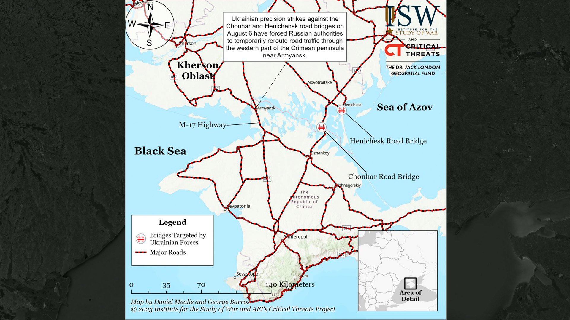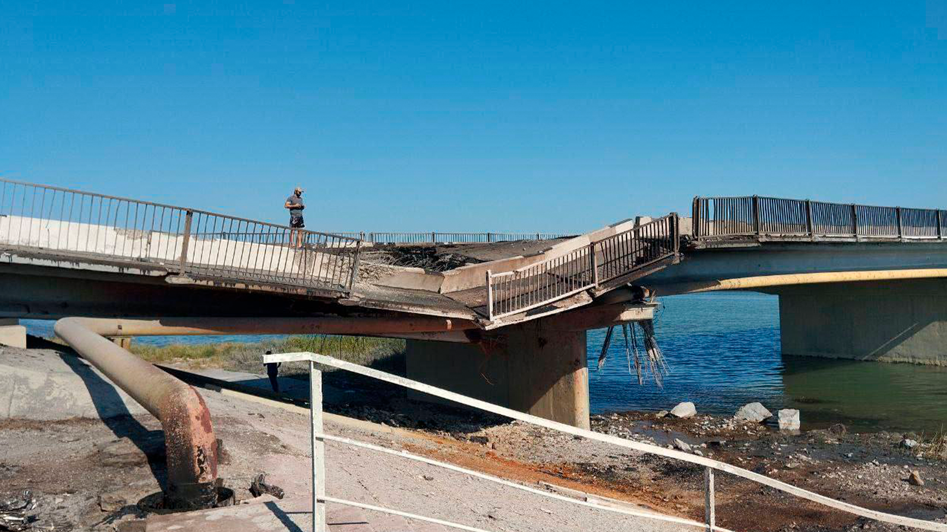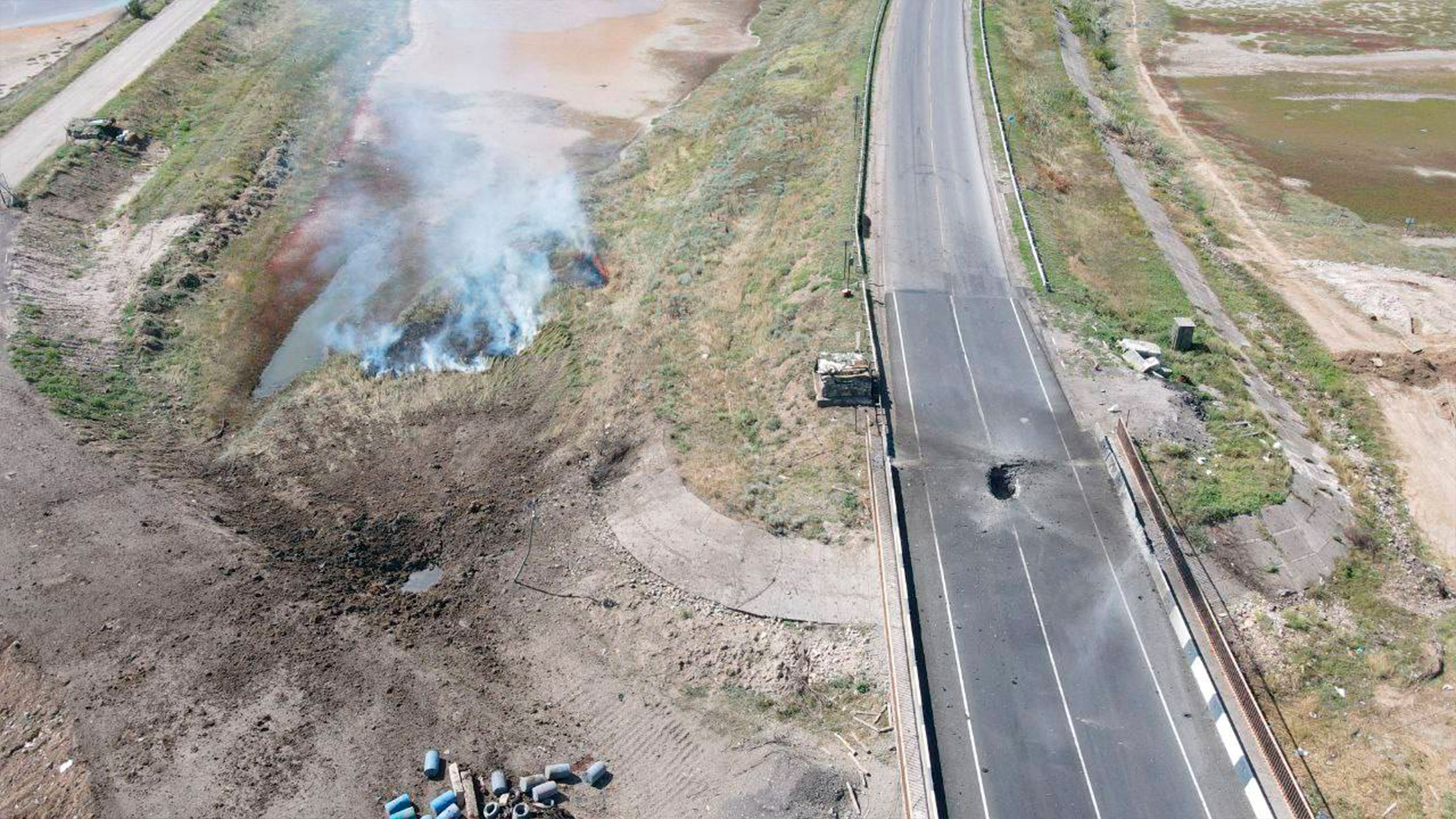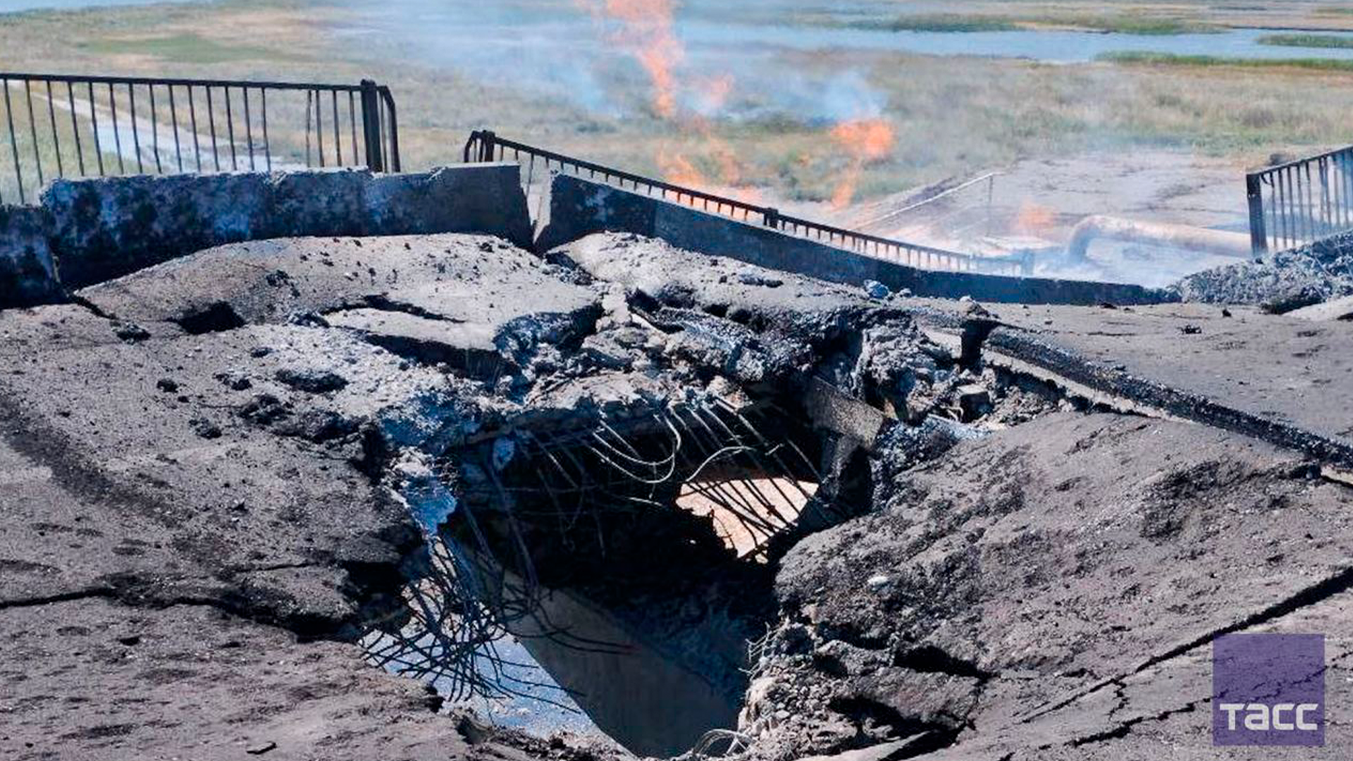 А вот это — фото моста в Геническе, он ведет на Арбатскую стрелку. Тут повреждения куда серьезнее, сам мост почти обрушился, был поврежден и загорелся также небольшой газопровод рядом. Если посмотреть по карте, видно, что атакованы транспортные линии, ведущие из Крыма в Херсонскую область и к запорожскому фронту. Несмотря на то, что российские власти заявляют, будто все в порядке, сейчас любая задержка и затруднение поставок может играть существенную роль для российской армии.