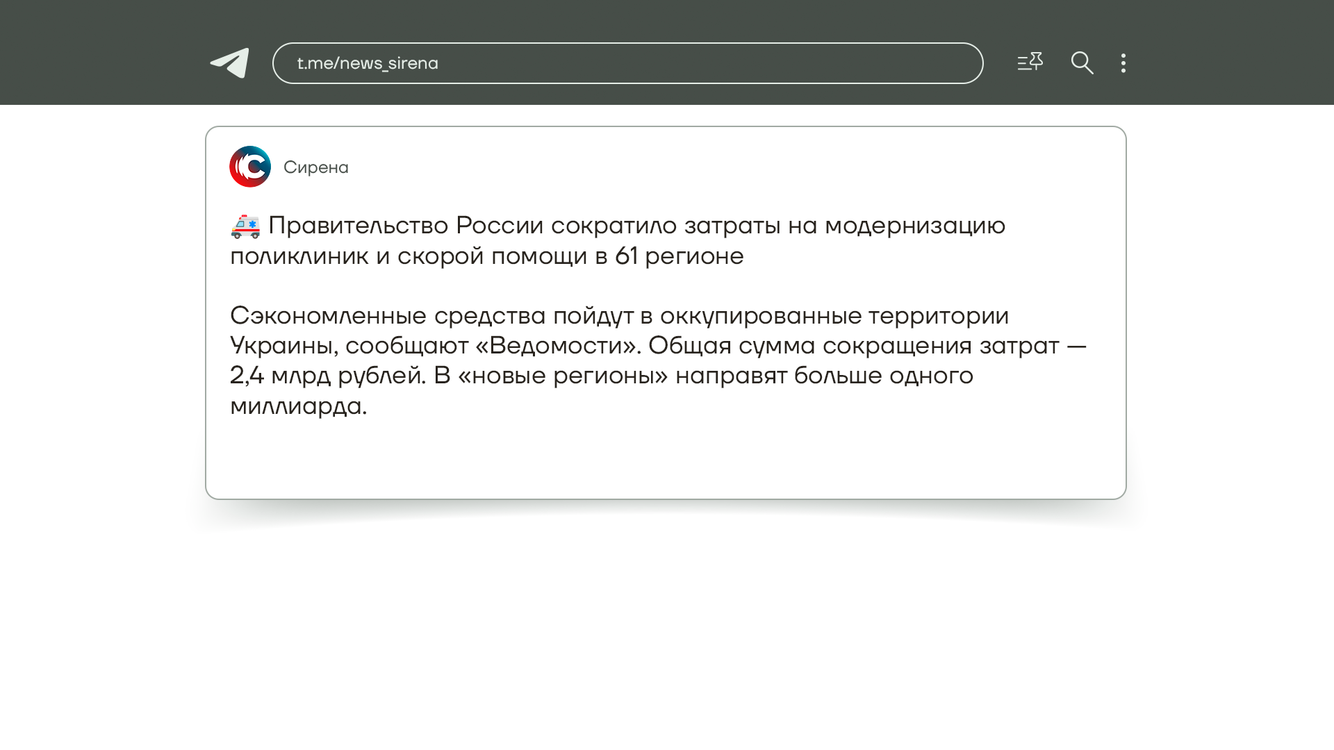 А вот другой пример. В 61 российском регионе сократят затраты на улучшение поликлиник и скорой помощи. Финансирование уменьшится на 2,4 миллиарда рублей. Деньги пойдут на оккупированные территории.