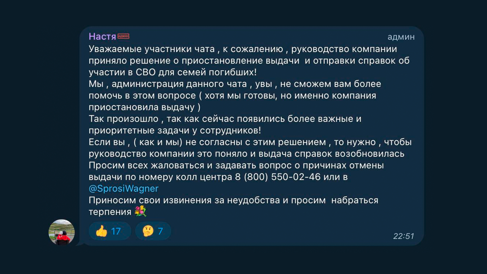 А вот вагнеровцам и их родственникам военные льготы, видимо, уже не светят. Им перестали выдавать справки о том, что наемники были участниками спецоперации. Работники самой ЧВК объясняют, что у них сейчас есть более важные и приоритетные задачи, чем справки выдавать.