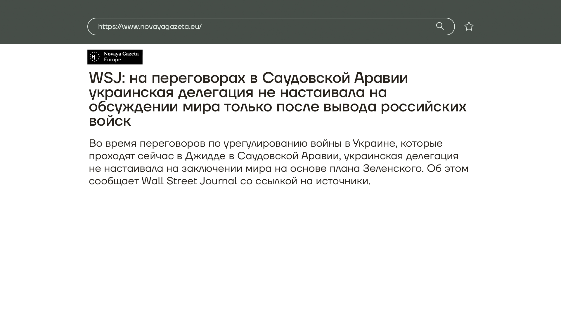 В Саудовской Аравии, в городе Джидде, прошел саммит, где обсуждалось завершение войны в Украине. Участие приняли более 40 стран, России среди них не было. По заявлению газеты Wall Street Journal, Украина на этом саммите больше не настаивала на своей предыдущей формуле мира, которая предусматривает полный вывод российских войск со всей оккупированной территории. Каких-либо официальных заявлений Украины по этому поводу не было.