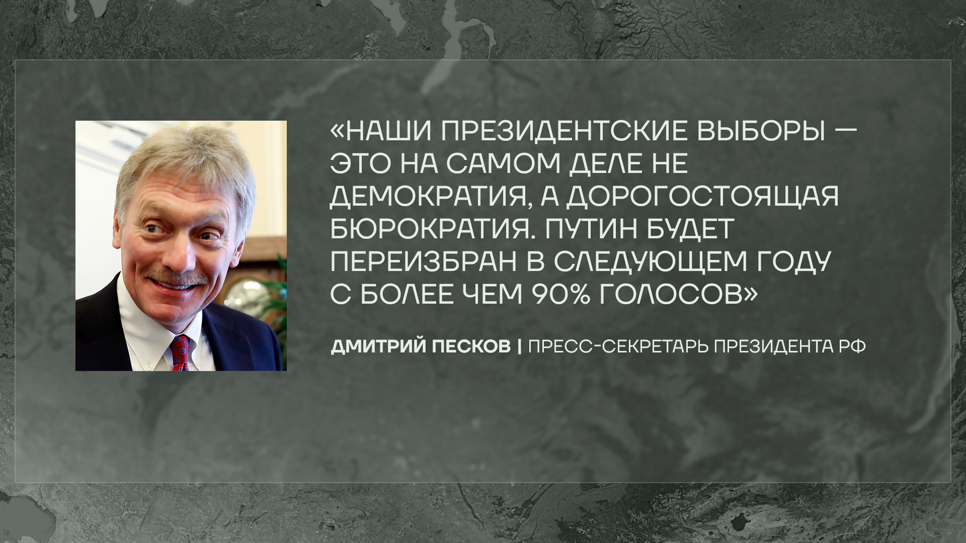 Песков дал интервью New York Times, и интереснее всего стало его высказывание про президентские выборы в 2024 году. Во-первых, Песков заявил, что в России никакая не демократия, а дорогостоящая бюрократия. Интересно, что это за политический режим такой. Ну а во-вторых, он прямым текстом сказал избиркому: на следующих выборах Путину нужно нарисовать более 90 процентов голосов.