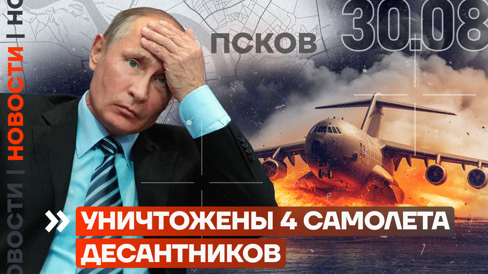 В Пскове подняли по тревоге всех сотрудников полиции. В городе слышались автоматные очереди — так пытались сбить беспилотники. Очевидцы говорят о 7 или 8 взрывах. Сообщают о повреждении 4 самолетов Ил-76 — это большие транспортные самолеты, которые используют в том числе для доставки десантников. Как минимум 2 из них полностью сгорели.