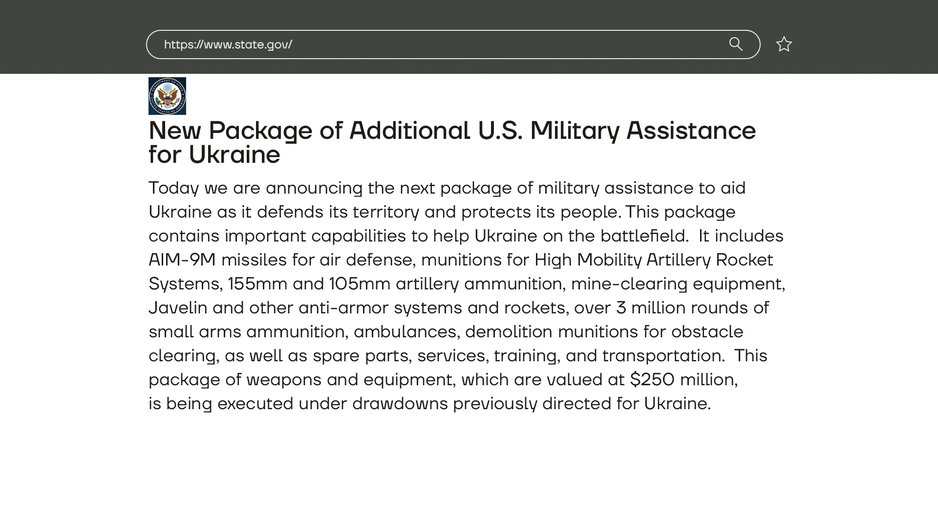 А США подготовили новый пакет помощи для Украины на $250 млн. Об этом сообщил госсекретарь Энтони Блинкен. В пакет помощи войдут средства для разминирования, снаряды, боеприпасы, ракеты для противовоздушной обороны.