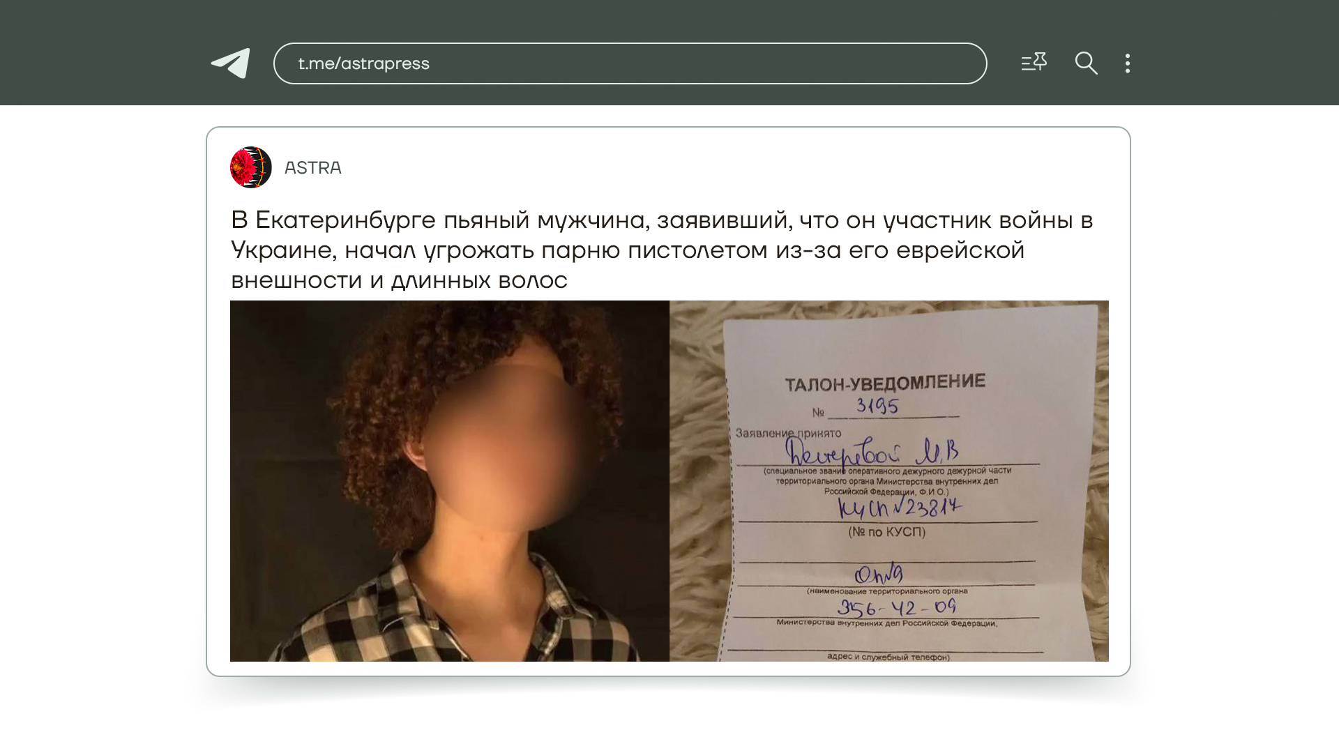 А вот очередная новость про вернувшихся с войны. В Екатеринбурге в подъезде дома к парню пристал приехавший с войны пьяный мужчина. Агрессивно спрашивал: «Ты черный или русский?» — видимо, из-за кудрявых волос. А на логичный вопрос о том, какое ему вообще дело, достал пистолет и стал угрожать расправой. Мужчину увезли в ОВД, но полицейские сказали, что максимум смогут завести административку за ношение оружия пьяным. Парню же посоветовали сменить место жительства. Ну, вот так у полицейских все просто: тебе угрожают — смени место жительства.