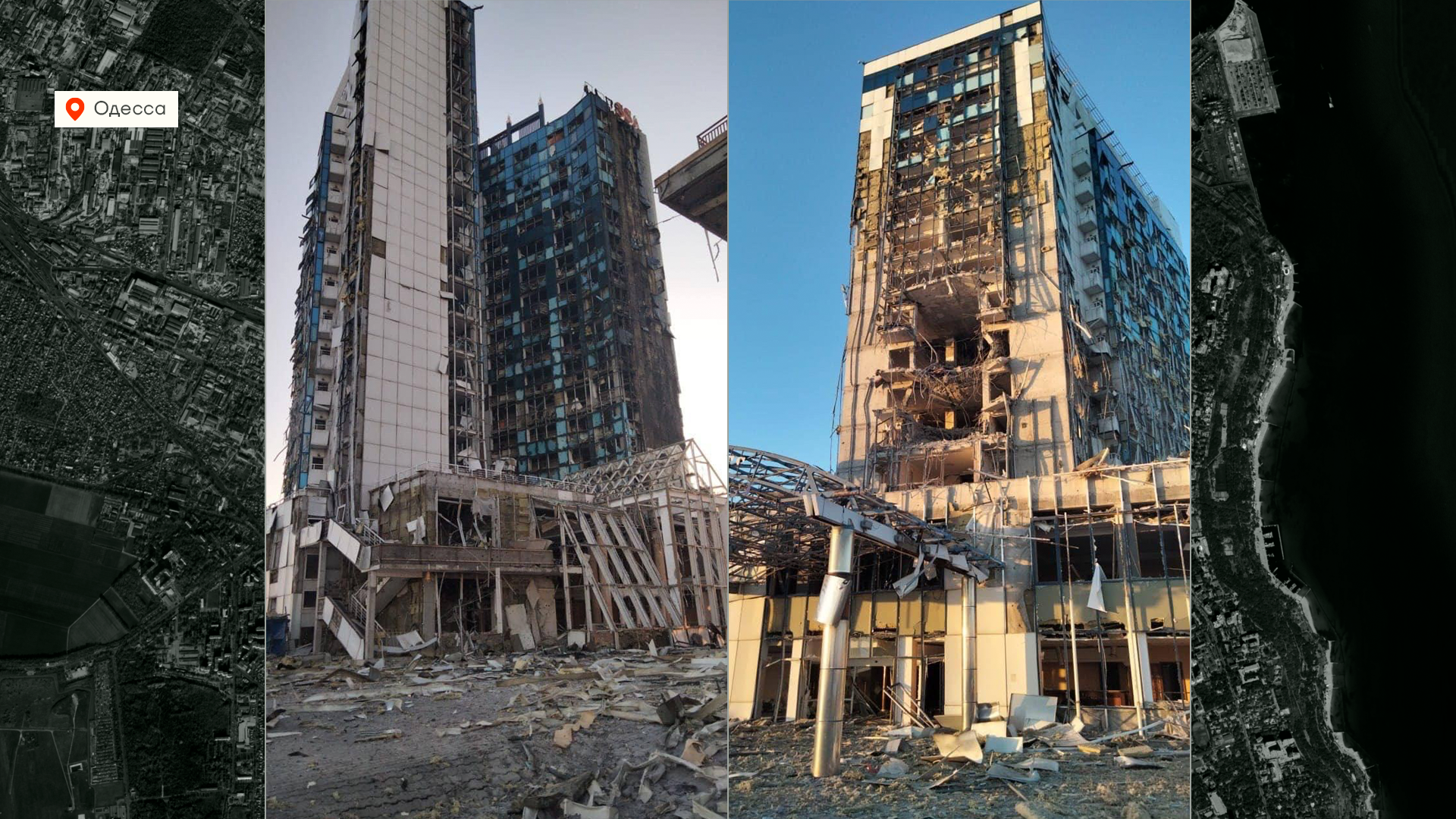 Российские военные устроили массированный налет на Одессу. 12 ракет «Калибр», 19 дронов Shahed и 2 ракеты «Оникс» атаковали зернохранилище и морской порт. Большая часть была сбита, однако здание вокзала и гостиница «Одесса» серьезно пострадали. При этом о погибших не сообщают. Гостиница стояла закрытой — она заброшена с 2011 года. Но по мнению российских военных, там находился скрытый штаб украинских ВМС. Вот такая ответка за удар по Севастополю получилась. Похоже ли это все на штаб флота — судите сами.