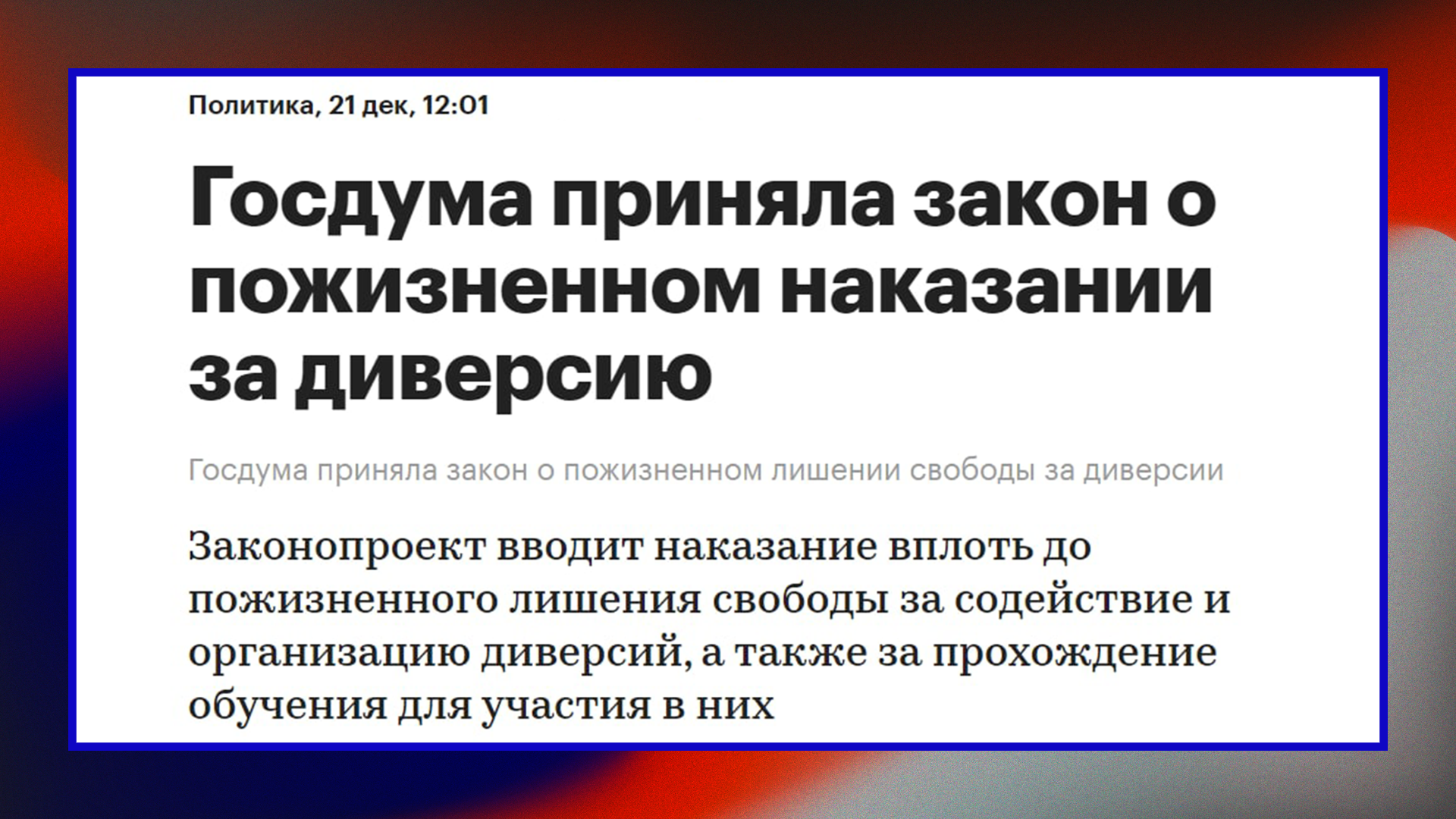 Буквально вчера Путин призвал лучше искать предателей, и вот сегодняшняя новость — в России будут давать пожизненные сроки за диверсии. Такими угрозами власть пытается предотвратить внутреннее сопротивление войне, например, порчу железных дорог, по которым везут технику в Украину. А силовики будут просто рубить палки — сажать за комментарии в интернете и ловить школьников. Поэтому будьте осторожны. Но, конечно, пожизненное — это речь о сроке жизни Путина — политической или физической. Потому что сопротивление войне — это богоугодное дело, и все кого сажают за любое сопротивление войне будут освобождены.