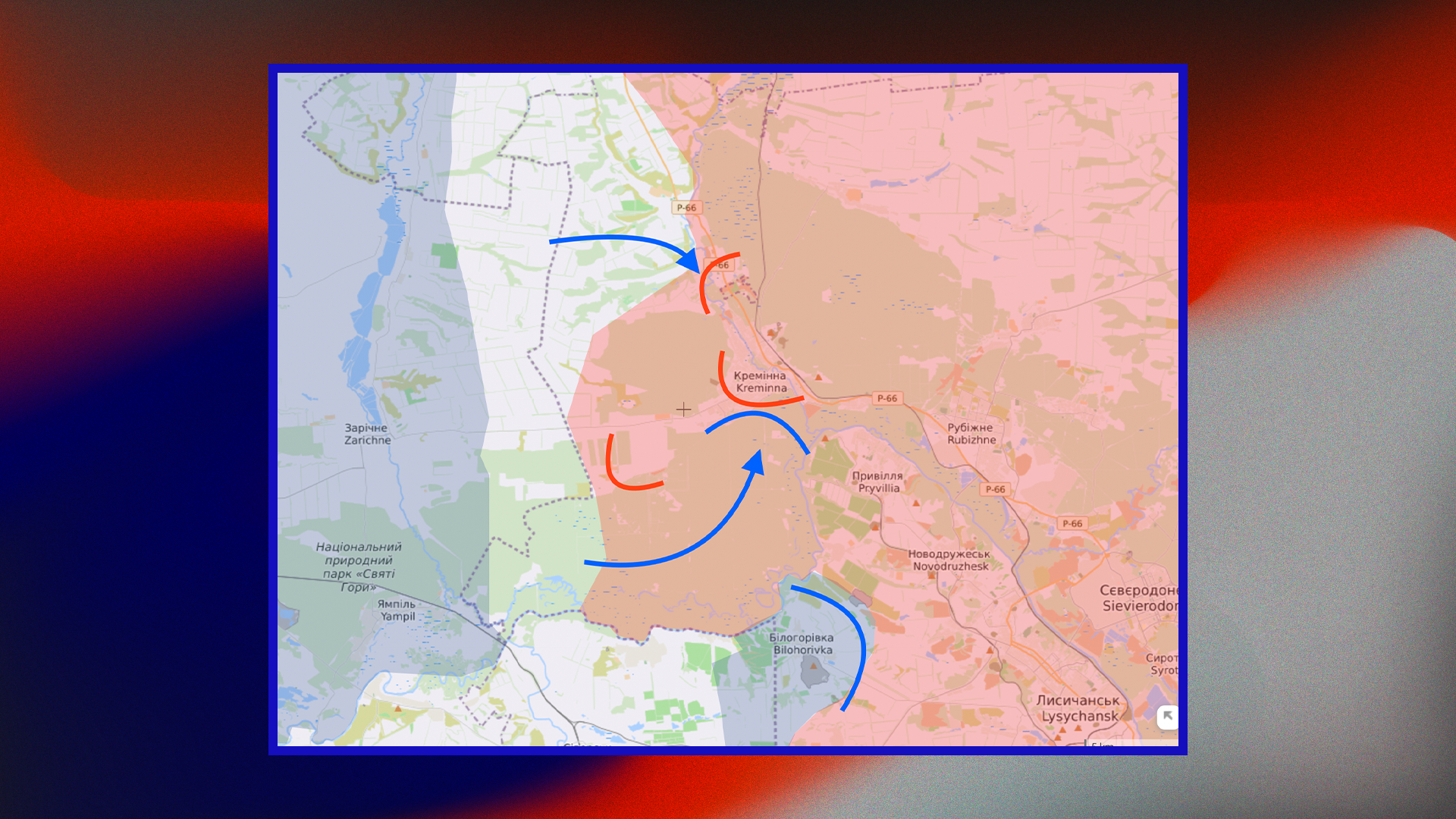 Но конечно ни на каком реальном фронте Путин не был. Давайте посмотрим, что там сейчас происходит. В Бахмуте продолжаются встречные бои на окраинах — пока без изменений. А в районе Кременной украинские войска готовят охват российских позиций с двух сторон — уже довольно давно они продвигаются по лесистой местности на берегу Северского Донца.