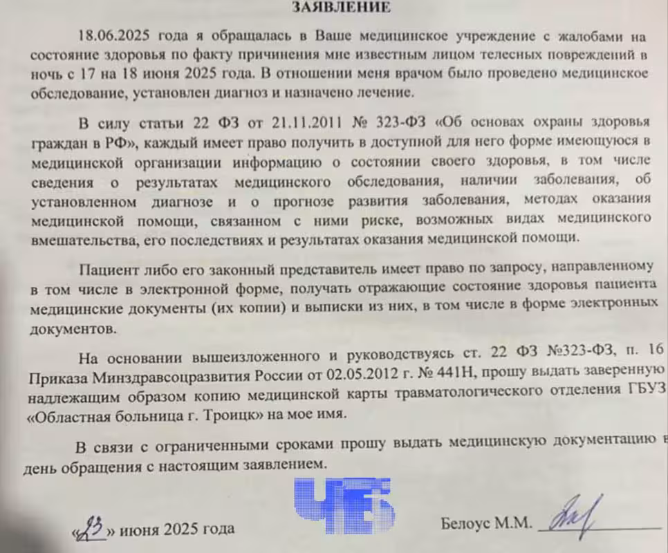 В полицию Марина обратилась в ту же ночь, однако постановление о судмедэкспертизе выписали лишь 20 июня старшим лейтенантом полиции Е. В. Утеевым. Экспертизу назначили только 24 июня. Но главная проблема оказалась не только в неспешности. Эксперт Клысов А. В. зафиксировал лишь три кровоподтёка на плечах и предплечьях, проигнорировав следы удушения и травму челюсти. Кроме того, результаты экспертизы и освидетельствования в травмпункте, а также медкарту Марине выдавать отказались.