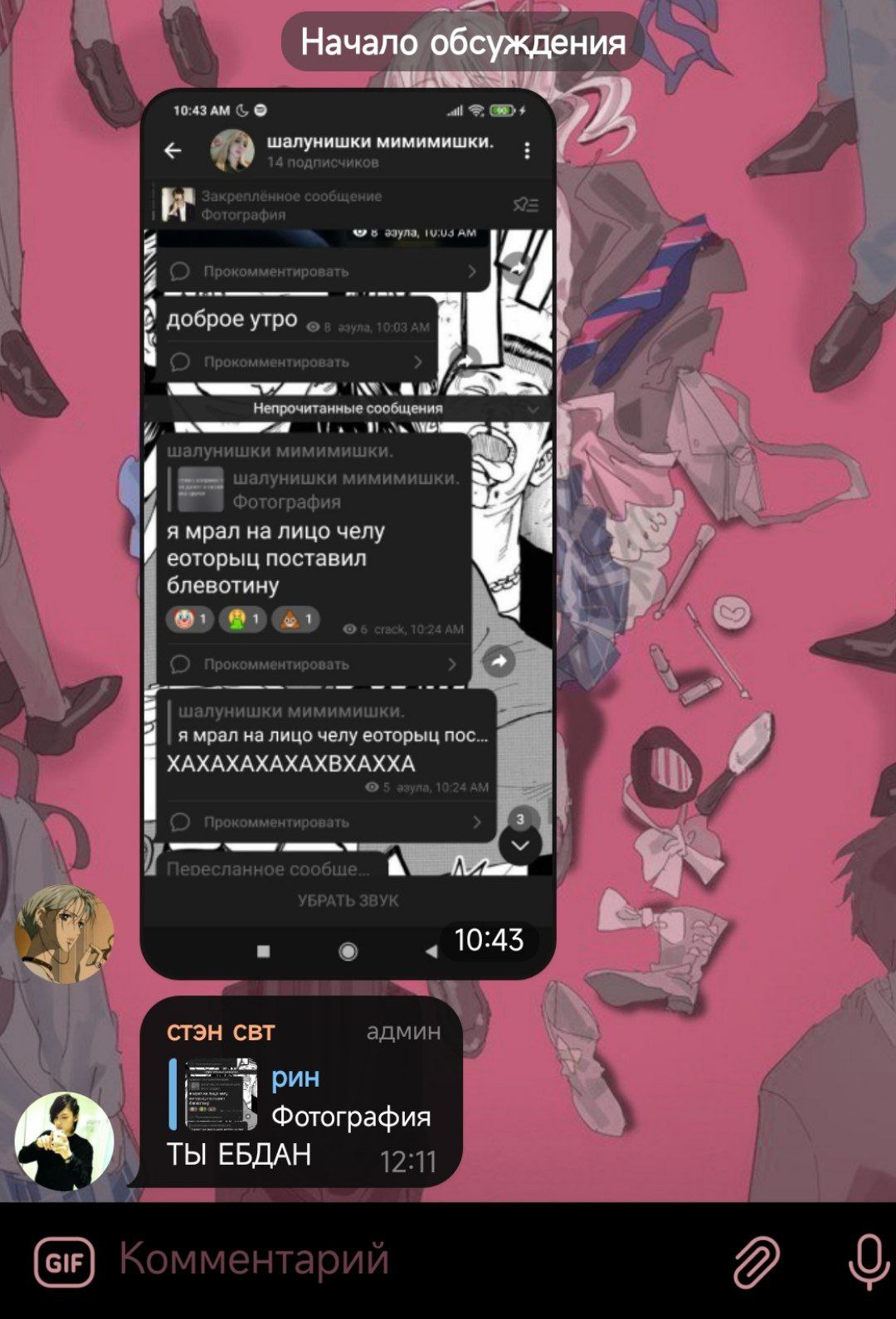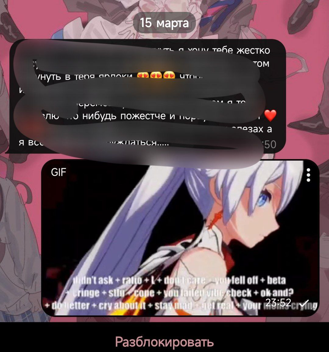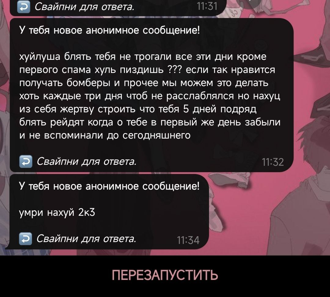 Послание всей этой кучке: я пойду в полицию, если вы не угомонитесь. Шучу, всё равно пойду. Взлом, травля, слив личной информации, слив информации родных, угроза взлома карт личных и т.д, рассылка бомбером уже похоже на оба номера, где на мой была дважды. (137, 282, 5.61 частично 110.1 ук рф)