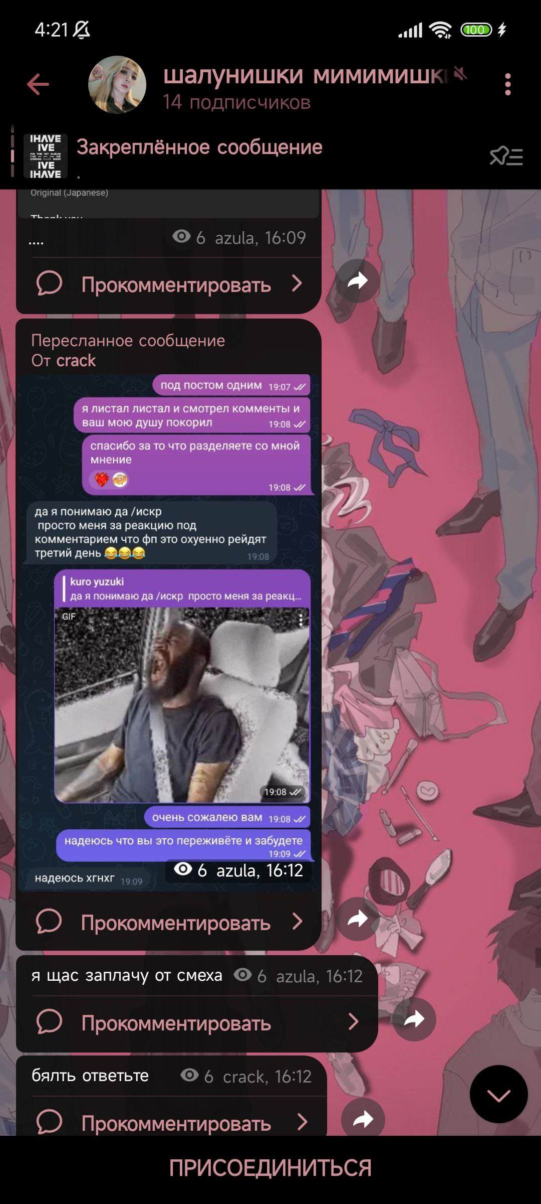 Помимо того, был сталкинг моего канала, репост моих постов, постов моих мьючалок на канале и т.д.
