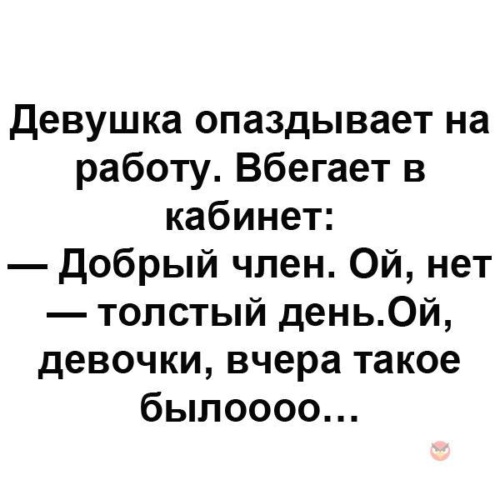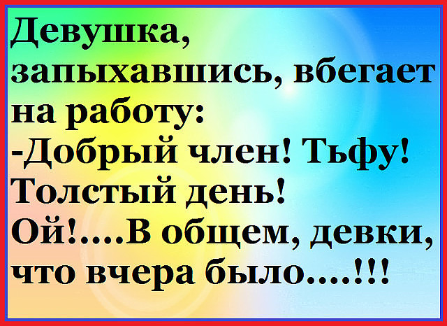 В общем, девки, чё вчера было… . Девушка, запыхавшись, вбегает на работу: — Добрый член! Тьфу, нет - толстый день! Ой! . . В общем, девки, чё вчера было… . следующая тема» . регистрация» .