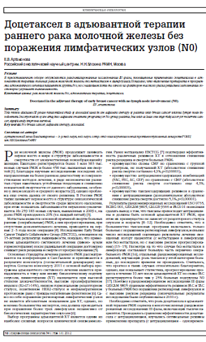При адъювантной терапии операбельного РМЖ с поражением регионарных лимфоузлов и операбельного РМЖ без поражения регионарных лимфоузлов рекомендуемая доза доцетаксела составляет 75 мг/м 2 через 1 ч после введения доксорубицина (50 мг/м 2) и циклофосфамида (500 мг/м 2) каждые 3 недели (схема ТАС) .