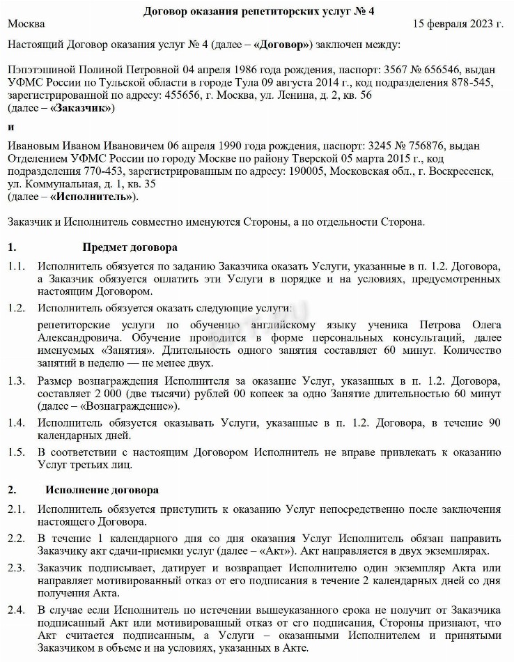 Договор репетитора с родителями