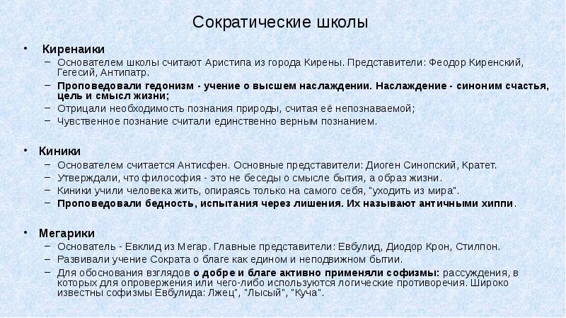 Его ученики -- Антипатр Киренский, Эфиоп и др . Ученицей Аристиппа была его дочь Арета . Она учила своего сына Аристиппа Младшего, а тот -- Феодора . . . . реферат [26,7 …