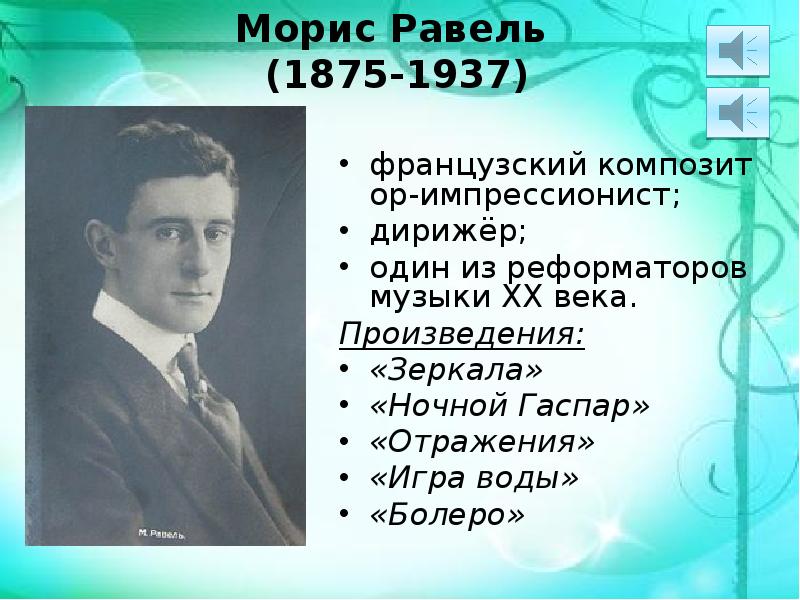 Морис Равель . Горячим последователем Дебюсси был Морис Равель . Он родился в 1875 г . в Пиренеях в семье швейцарского автомобильного инженера . Любовь к музыке …