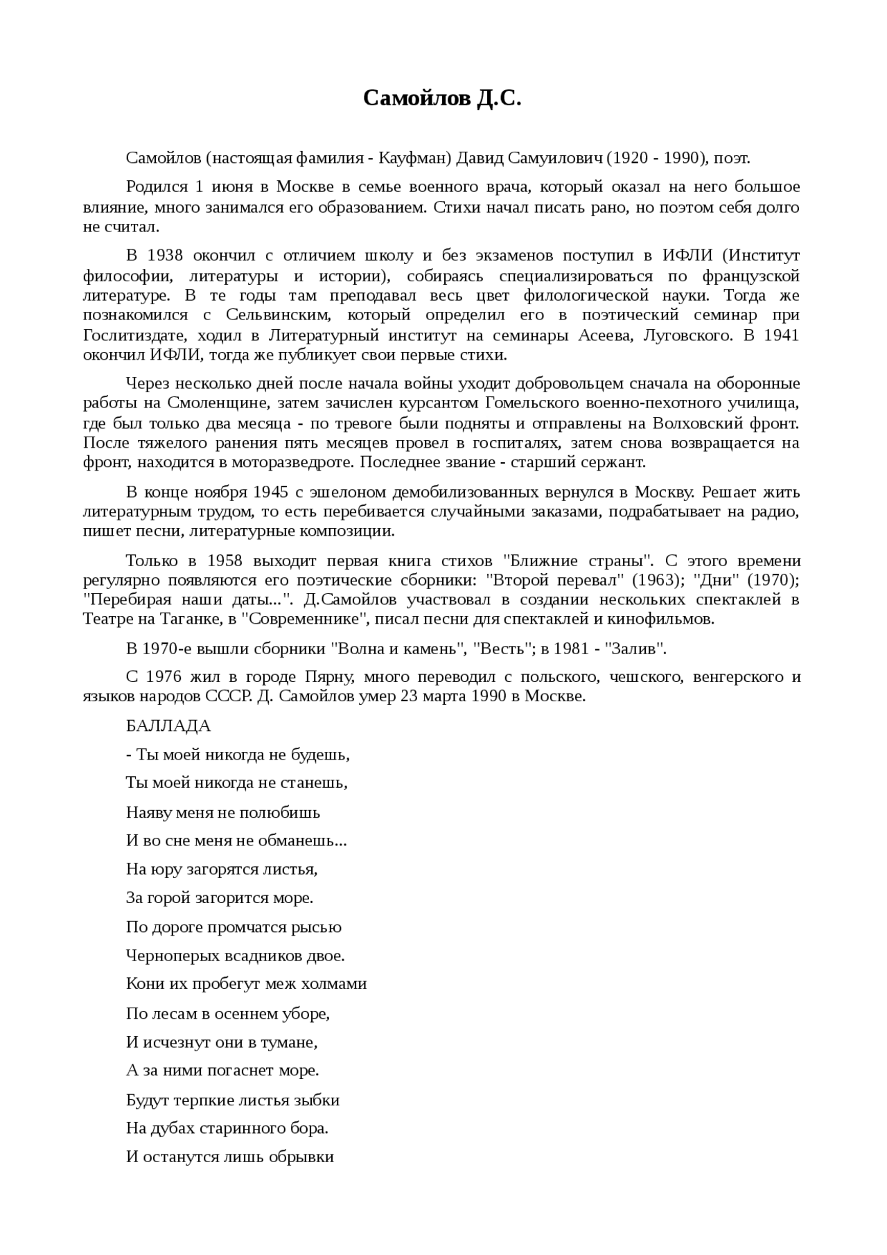 Доклад по литературе на тему: Самойлов Д .С . Тезисы: Самойлов (настоящая фамилия - Кауфман) Давид Самуилович (1920 - 1990) , поэт .