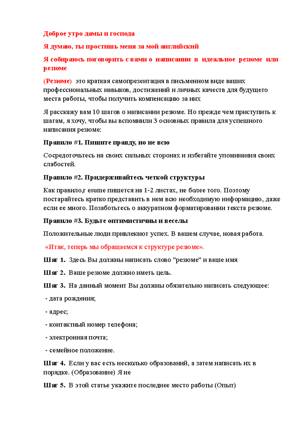 Доклад по теме Резюме: первый шаг к успеху
