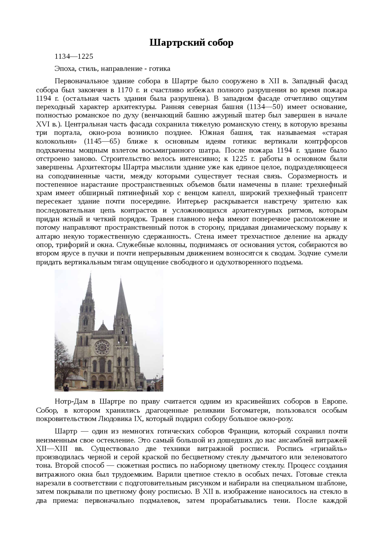 Шартрский собор, как и описанный выше собор в Париже, посвящен Богоматери . Что особенно интересно, в Шартре с 876 г . хранится Плащаница Девы Марии, являющаяся одной из …