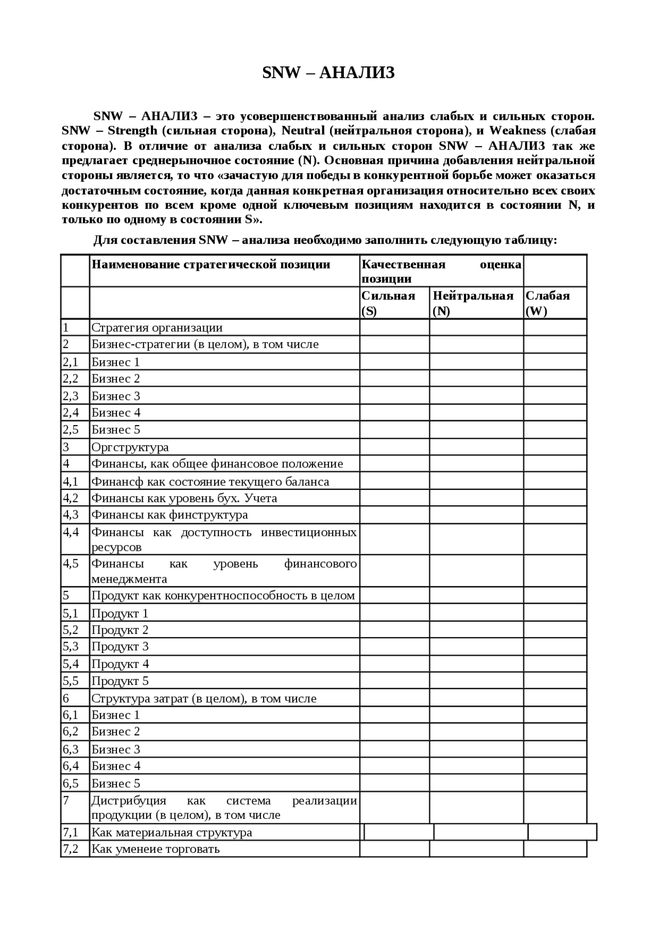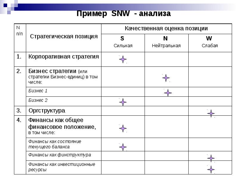 SNW - анализ . SNW - АНАЛИЗ . SNW - АНАЛИЗ - это усовершенствованный анализ слабых и сильных сторон . SNW - Strength (сильная сторона), Neutral (нейтральноя …