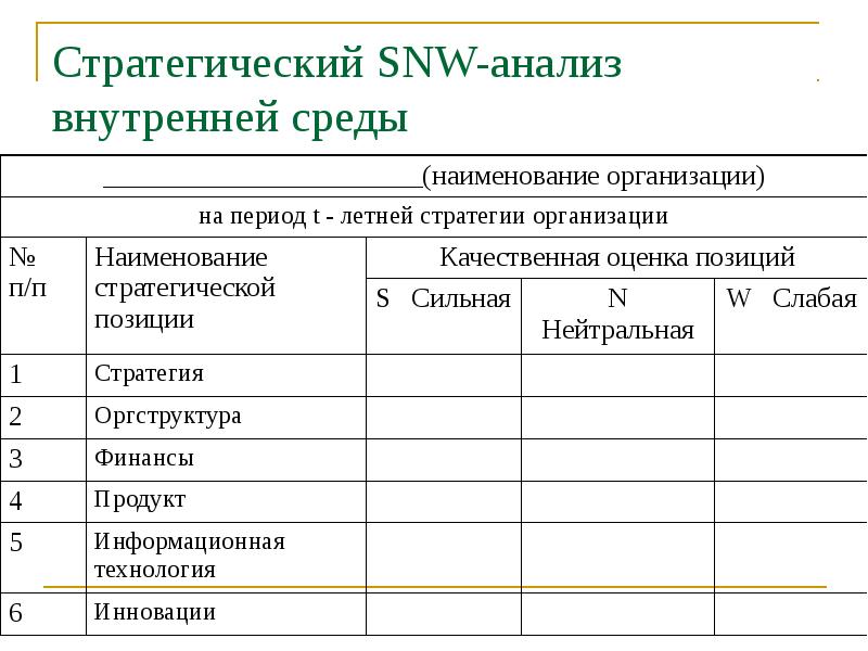 Слайд 11 . Описание слайда: SNW -анализ - это анализ слабых и сильных сторон организации, оценивается внутренняя среда по трем значениям: Strength (сильная сторона), …
