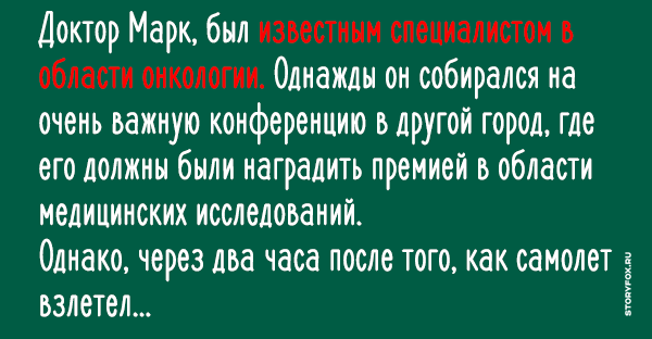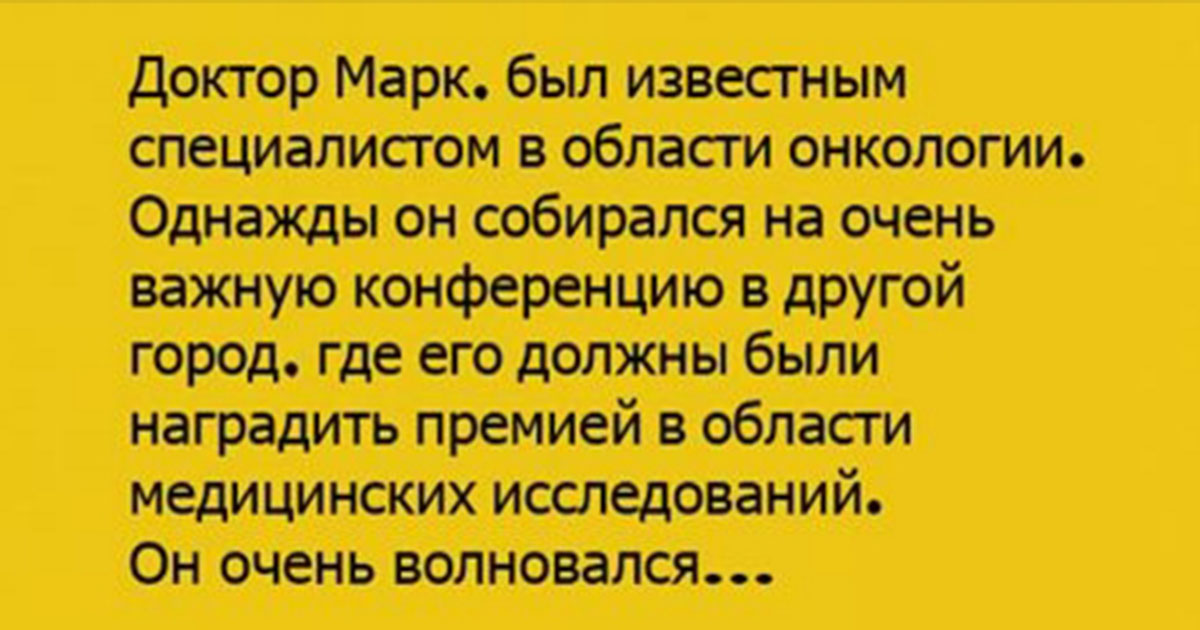 Доктор Марк, был известным специалистом в области онкологии . Однажды он собирался на очень важную конференцию в другой город, где его должны были наградить премией в области медицинских исследований .