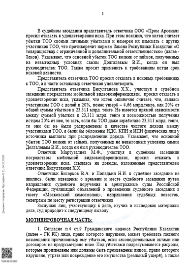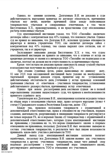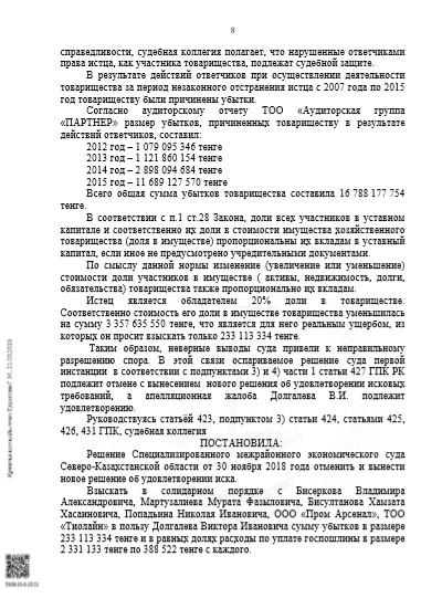 Постановление судебной коллегии о возмещении убытков Долгалеву В.И. в размере 233 113 334 тенге.